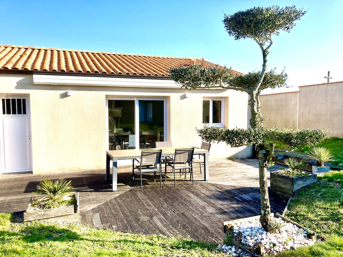 Yaşıl mühitdə müasir rahatlıq, cazibə və orijinallığı birləşdirən bu səmimi məkanın zövqünü çıxarın. 10 nəfər üçün idealdır/ Yaxşı təchiz olunmuş mətbəx, keyfiyyətli çarpayıları olan 5 yataq otağı. Dostlarınız və ailənizlə birlikdə vaxt keçirmək üçün 2 kiçik, rahat qonaq otağı sizi gözləyir. Geniş saunasından zövq alın. Noirmoutierdən 1 saat, Sables d 'Olonne-dən 20 dəq. Vendee Space-dən 10 dəqiqəlik məsafədə Ev Sahibiniz Sofi
