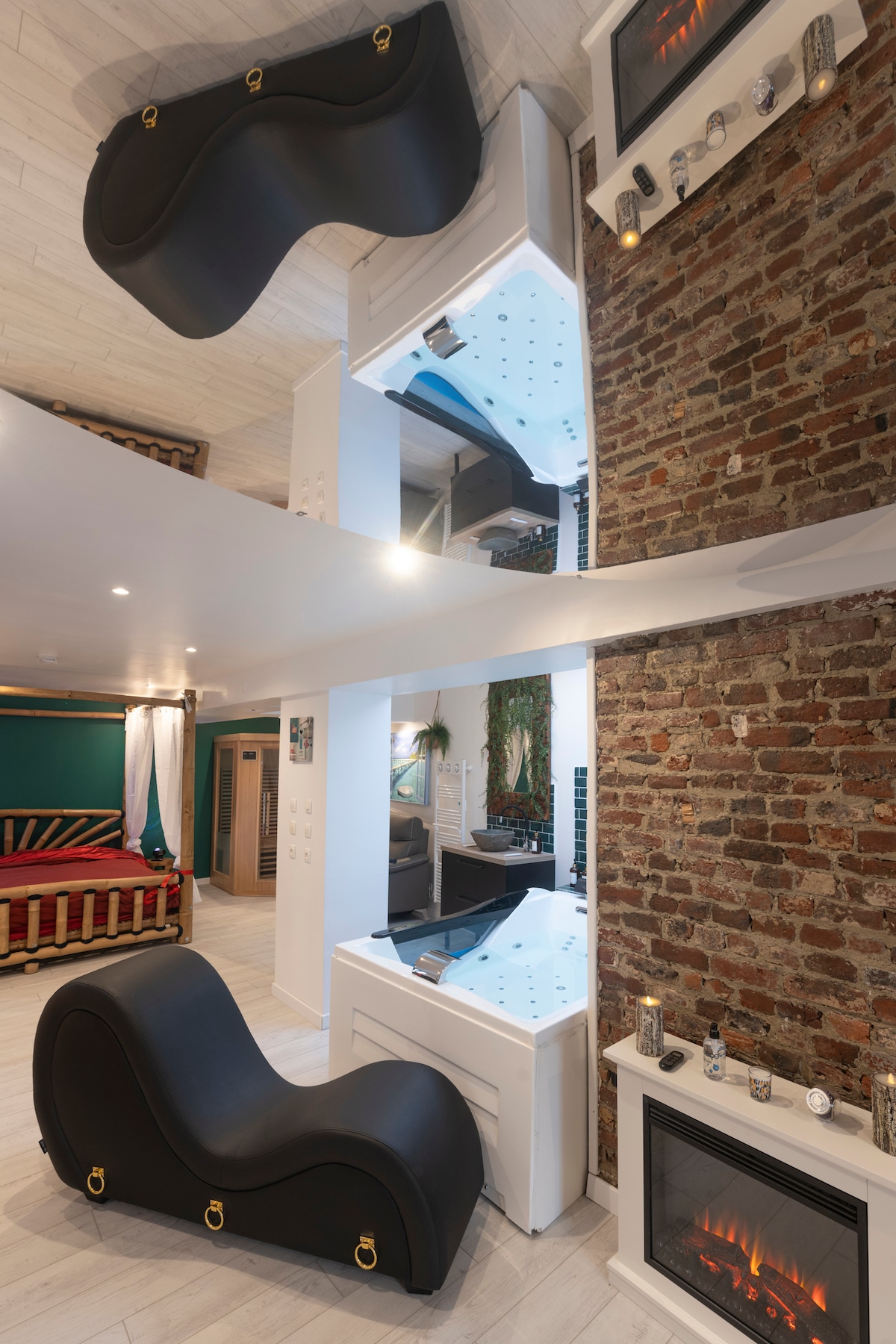Plongez dans l’évasion et la sensualité de notre secret room, un cocon au charme balinais pour une nuit d’amour inoubliable. Profitez d’une baignoire balnéo, d’un sauna relaxant pour des instants de détente, et laissez libre cours à vos désirs avec le fauteuil tantra sublimé par un miroir XXL Riez ensemble autour du baby-foot, puis offrez-vous une nuit douce et voluptueuse dans un lit king-size 2m X 2m aux draps satinés. Calme, exotisme et passion vous attendent Réservez vite ! netflix inclus.