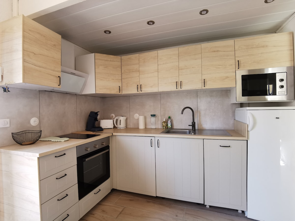 Böyük bağı və ayrıca pétanque ərazisi olan çimərlikdən 750 m məsafədə AGDE Kondisionerli studiya 750 m məsafədə Təxminən 25m² studiya İkinəfərlik çarpayı 140* 200 sm Divan Tam təchiz olunmuş mətbəx (soba, qabyuyan maşın, mikrodalğalı soba, toster, qəhvə maşını, çaydan, soyuducu) Nespresso Duş otağı +WC Böyük TV Kondisioner Ayrıca eksteryer Petank meydançası böyük bağ Masa və açıq havada 4 stulu olan terras 2 göyərtə 1 alaqaranlıq qril Qiymətə daxildir: - Döşəkağılar və hamam dəsmalları təmin edirik - Wi-Fi