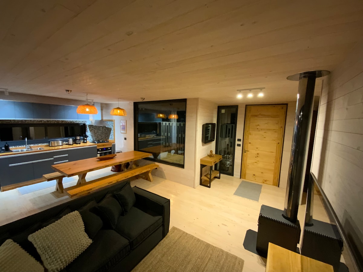 Loft Punta de Lobos is a modern loft 1,000 meters above Punta de Lobos, Chile. It fits 4 guests, expandable to 6 with our flexible rate. Enjoy stunning sea views and a peaceful cypress forest, just 100 meters from Surf Lodge. The loft has a main bedroom with a private bathroom, plus two futon/sofa beds and bunk beds upstairs. Outdoors, find a barbecue area with grill, fire pit, dining table, and mini-bar. Inside, rope straps are available for surfboards.