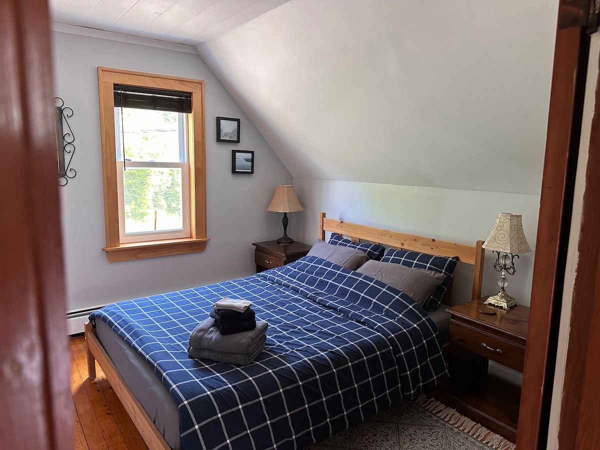 Stay at the best room at the North River Lodge. A chalet style room with exposed beams, a large picture window looking at Murray mountain and where the North River is visible some of the time. Loads of light throughout the 6 windows and a large skylight over the claw foot tub. This room has a bathroom inside within room for full privacy and private access. The morning sun shines in and the moon lights up the room at night. Up with the sun in this room! One queen size bed and one single day bed.