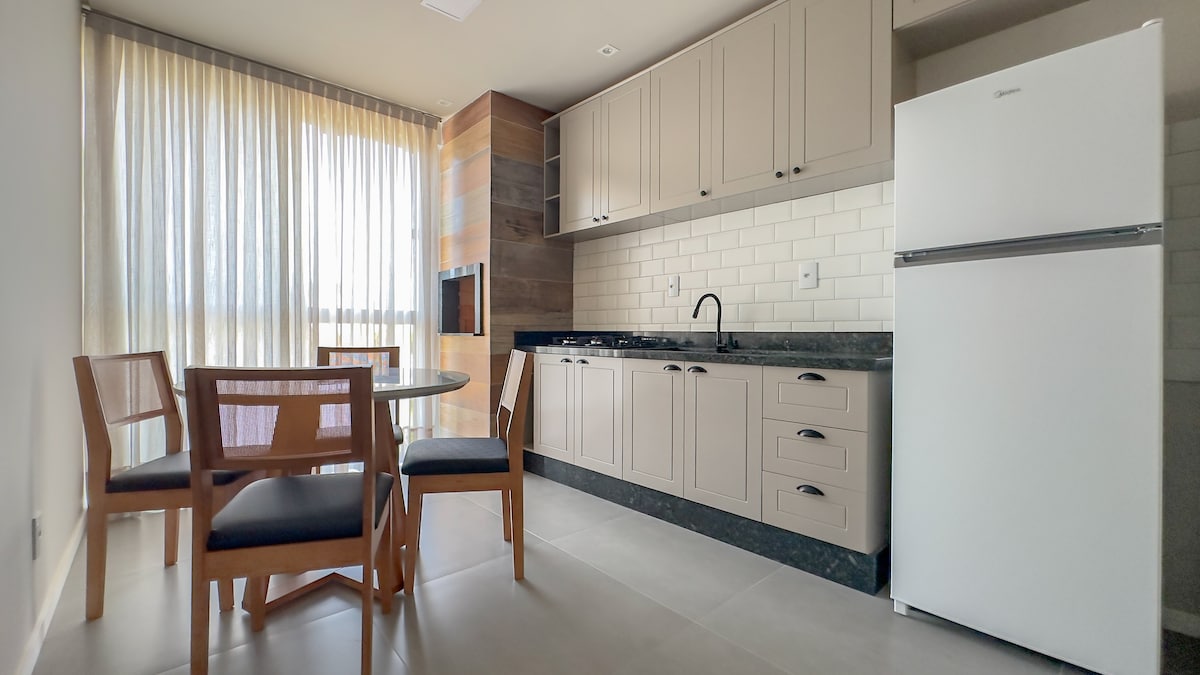 Beautiful studio apartment with garage, in the center of Blumenau, near everything! Building has a gym and an incredible rooftop pool. The apartment is complete and very stylish. Double bed, sheets, covers, pillows, bath towels, AC. Full kitchen with refrigerator, microwave and tableware for 2. Laundry with iron table and iron.