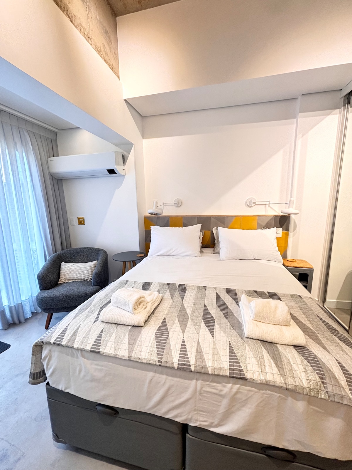 V metrodan 300-ü. Madalena, restoranlara, mağazalara, barlara və mədəni məkanlara yaxındır. Çox rahat ikinəfərlik çarpayı, A/C, internet, SmarTV 42", böyük iş masası, yemək masası, dəbli dekorasiya, çoxlu təbii işıq və şəhər mənzərəsi olan çəkilə bilən pəncərələr. Mətbəx Kompaktında mini soyuducu, elektrikli iki soba piştaxtası, su filtri, sendviç aparatı, blender və qab-qacaq var. Kondisionerli hovuz, fitnes mərkəzi, camaşırxana və mini mərtəbəli.