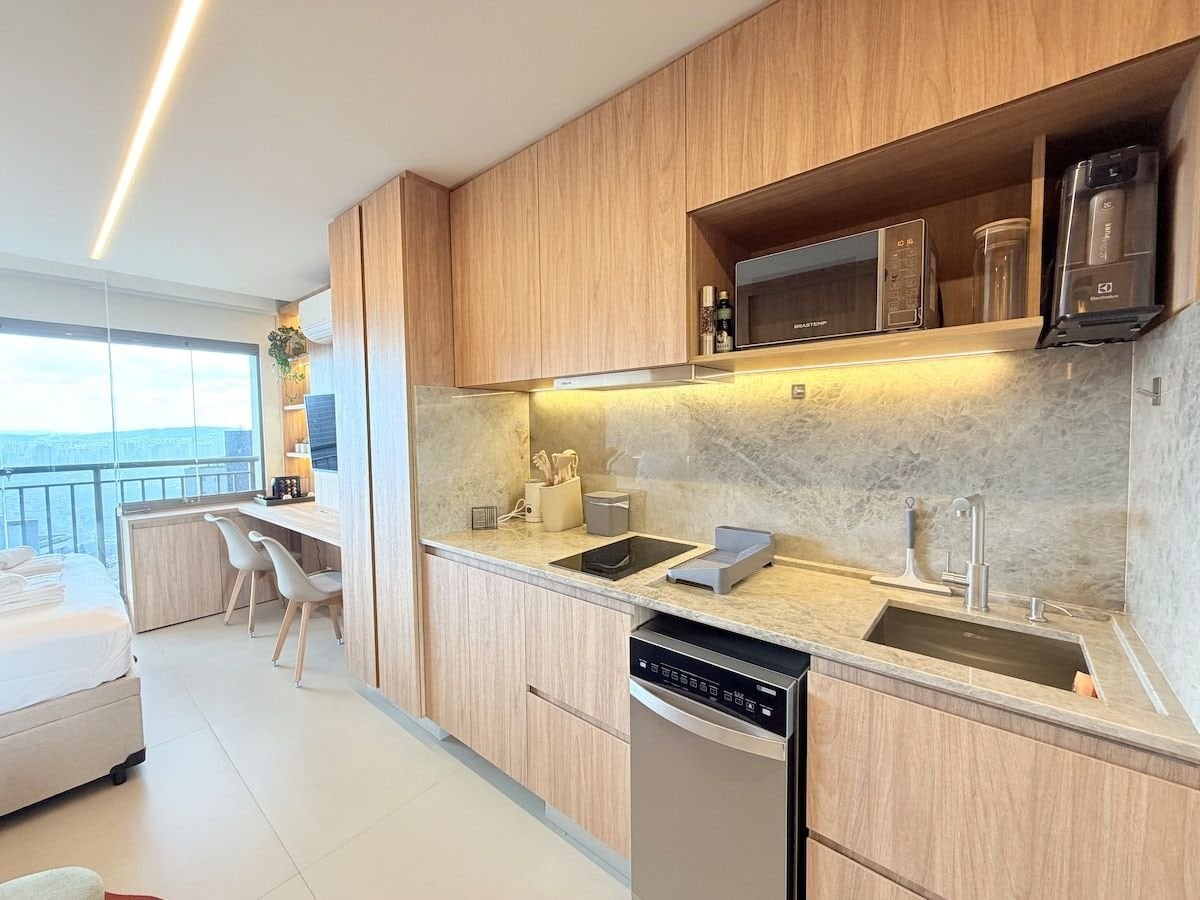 Estúdio espaçoso com muito design, arquitetura e a melhor vista de São Paulo. Loft completo! Com cama queen, closet, ar condicionado silencioso, cozinha completa, home office, WI-FI, TV 55” e uma belíssima banheira de imersão, de onde pode apreciar o seu drink preferido e curtir uma vista apaixonante. São Paulo toda estará há poucos minutos de você. Acesse o metrô andando apenas 200m. Reserve com tranquilidade! Proporcionaremos uma excelente hospedagem e uma ótima experiência!