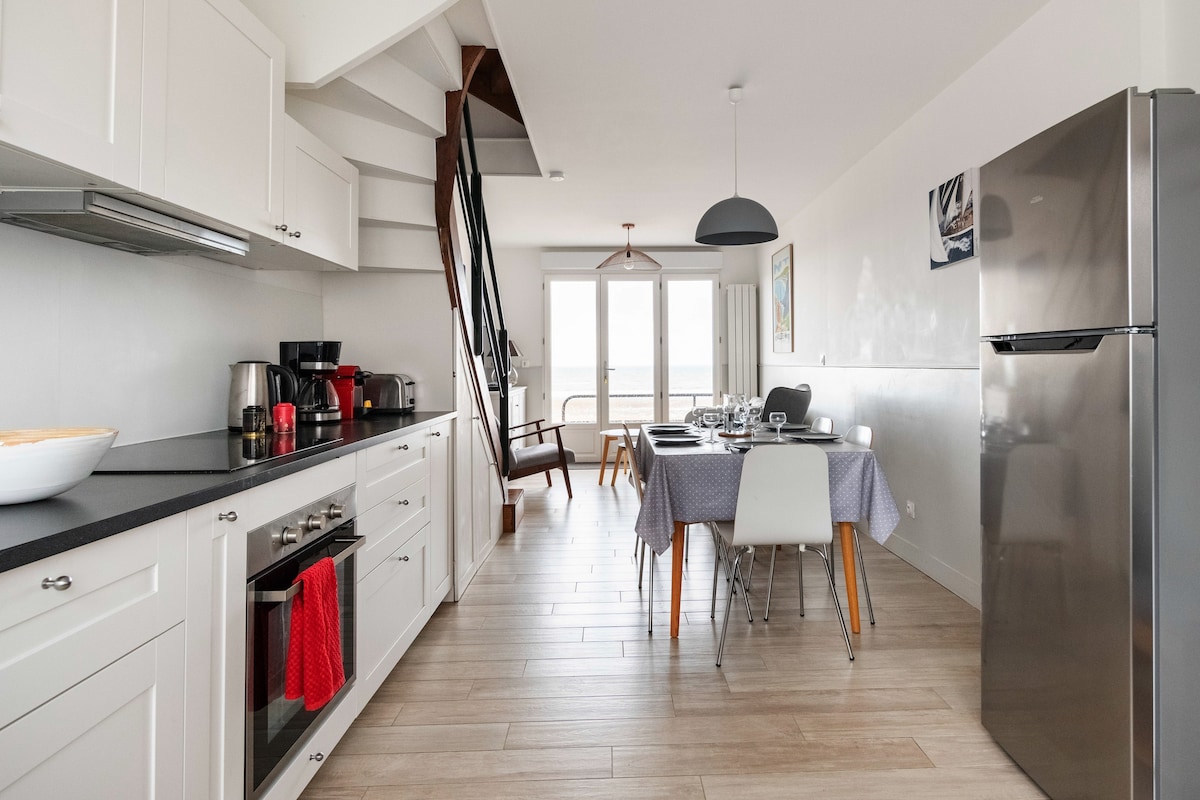 ⭐️ ⭐️ ⭐️ Klassik Qonaqlama 3*** 🚗 Qonaqlar üçün ayrıca parkinq yeri mövcuddur. 🌊 Unikal sahilyanı mövqe. Çimərliyə birbaşa giriş. 180° dəniz mənzərəli. 🛍️ Mənzil şəhər mərkəzinə və mağazalara 2 dəqiqəlik piyada məsafədədir. 🛁 Yataq dəsti, hamam otağı dəsmalları və nümunələr təmin edilir. Qarşılama səbəti. ⚓️ 2024-cü ildə tamamilə təmir edilmiş, 100% dəniz dekorasiyalı yaşayış yeri. Yaxınlıqda: Deauville, Trouville, Caen, Greenwich Meridian, Paléospace Museum, Courg, Honfleur...