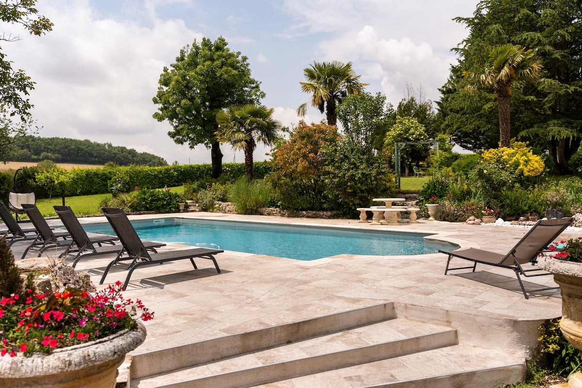 Luxury French gite, just outside the lovely market town of Aubeterre. Refurbished to a very high standard, with a large open-plan kitchen/family room , 1 Double bedroom downstairs & 2 Twin bedrooms upstairs (all with private shower room). 10 x 5m HEATED (May and September ) pool over looking open fields and large patio. Walk into the local village to make use of the local shop for your fresh morning bread and croissants etc, or enjoy rivers, chateau and vineyards further afield.