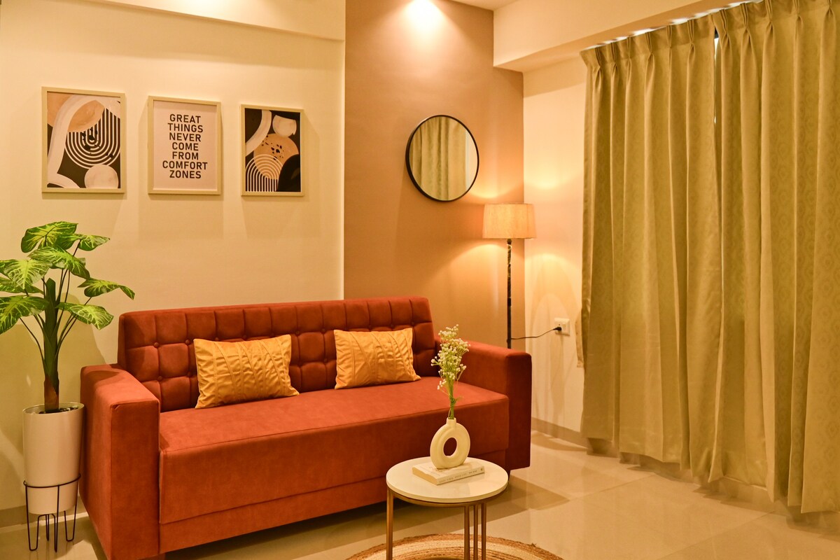 Step into 404 Luxe Haven, a thoughtfully designed 404 sq.ft studio apartment blending modern comfort, warm lighting, and elegant interiors. Featuring a signature mustard velvet sofa, a cozy queen bed framed with floral backlighting, a stylish modular kitchen, and a relaxing balcony with greenery, this space is perfect for singles, couples, or business travelers. Enjoy a peaceful ambiance with contemporary décor, soft neutral tones, and every essential curated for a seamless stay.