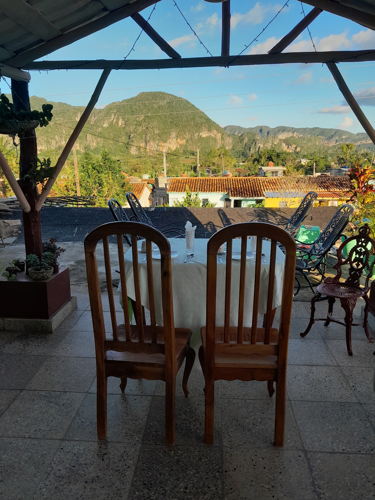 Las habitaciónes son muy espaciosas, tienen baño privado e incluye 4 camas dobles y 1na personal que permite hasta 9 personas si es necesario. Las habitaciónes están equipadas con aire acondicionado y una pequeña nevera que se puede utilizar y está disponible para bebidas frías. La verdadera ventaja de esta casa es una vista de las montañas de Viñales desde la terraza. A petición se puede disfrutar de sus comidas y desayunos. Disfrutar de una buena comida desde este punto de vista!