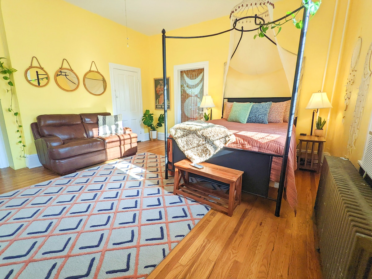 Unique Urban Artistic Loft of 1,275 sq ft in a historic 1906 building. Prime Location in Downtown, a short stroll from top restaurants, breweries, museums, parks, and events. The Amtrak station is only one block away! Convenience of free onsite parking for one vehicle. Serene environment with 15-ft ceilings, in-floor heating and no exterior windows for minimal noise. Queen bedroom with high-quality linen sheets and a Queen sleeper sofa in the living area. Fast WiFi throughout the space.