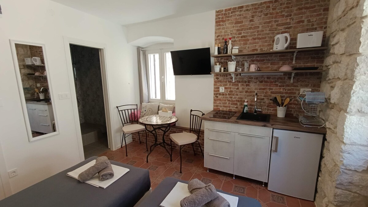 Köhnə daş evdə dənizə baxan şəhərin mərkəzində, Avropanın ən qədim xalq teatrından və Venesiya arsenalından atılan daşdan zövq alın. Mənzil (18 m2) 2025-ci ildə tamamilə uyğunlaşdırılıb və evin ikinci mərtəbəsində yerləşir.