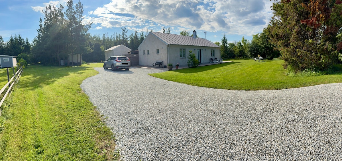 Exklusivt 1,5-planshus med vardagsrum/fullt utrustat kök och öppen spis, 4 sovrum varav ett med en suite och sjöutsikt. Gästhus med dubbelrum, loft med två bäddar, dusch/WC och vardagsrum med pentry (kokplatta, kyl, ho). Pool mellan husen, omgiven av terrasser och gräsmatta – perfekt för umgänge. Nära vacker strand och fina promenader. Lugnt läge utan genomfartstrafik, 10 min från Visby. Plats för 4 bilar, elladdare.