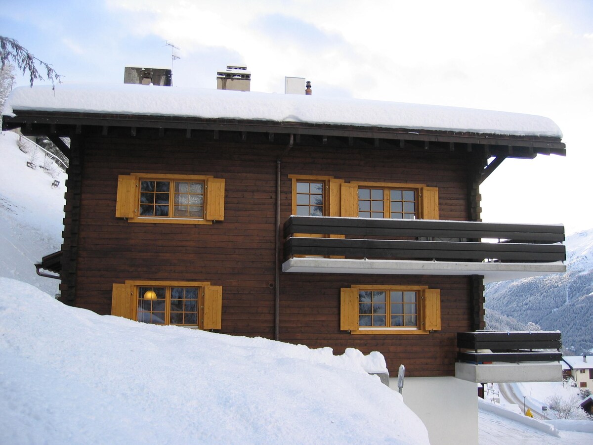 Bright 3-room apartment in a small chalet of 3 dwellings at 5 minutes walking distance from the funicular and the village centre. Drop off your car at your arrival on the included parking spot, no need anymore. You have a breathtaking view of the peaks of the Val d'Anniviers from the terrace. Ideal for 4 people, possible up to 6 (2 extra beds for children). Kitchen, windows and heating completely renovated for optimal confort.