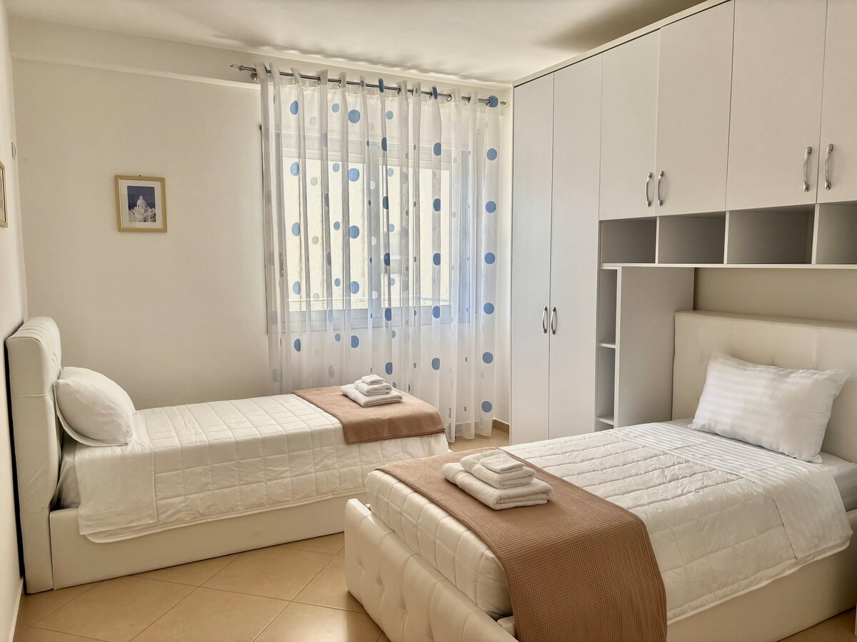 Vlorada, çimərliyin bir neçə addımlığında sevimli mənzil! Ailələr, dostlar və ya rəqəmsal köçərilər üçün mükəmməldir. Bu işıqlı və rahat 2 yataq otağı, 2 hamam otağı olan mənzildə heyrətamiz, fasiləsiz dəniz mənzərəli ayrıca balkon var. Tam təchiz olunmuş məkandan, güclü routeri olan yüksək sürətli WiFi-dan, yerli kafelərə, restoranlara, mağazalara, tennis kortlarına və ya Lungomare (sahil xətti) boyunca günəşli velosiped gəzintisindən zövq alın. Mənzilimizdən Dhërmi, Livadh və s. kimi məşhur çimərliklərə qısa tətildir.