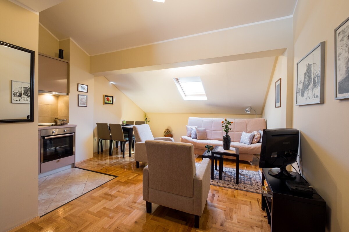 Vuk abidəsinin yaxınlığındakı sakit bir küçədə gözəl bir yeni binada mərkəzdə yerləşən brend mənzil. Aşağı səviyyədə divan çarpayısı olan qonaq otağı (160x200 sm.), yemək sahəsi və hamam otağı ilə tam təchiz olunmuş mətbəx var. Yuxarı mərtəbədə ikinəfərlik çarpayısı (160x200 sm) və qarderobu olan yataq otağının yerləşdiyi füsunkar çardaq sahəsi var. Mənzil tək səyahət edənlər, cütlüklər, 3 nəfərlik qruplar və işgüzar səyahətçilər üçün uyğundur. Yeraltı ictimai təhlükəsiz qaraj 800 metr uzaqlıqdadır. Respublika Sahəsinə piyada 20 dəqiqəlik məsafə