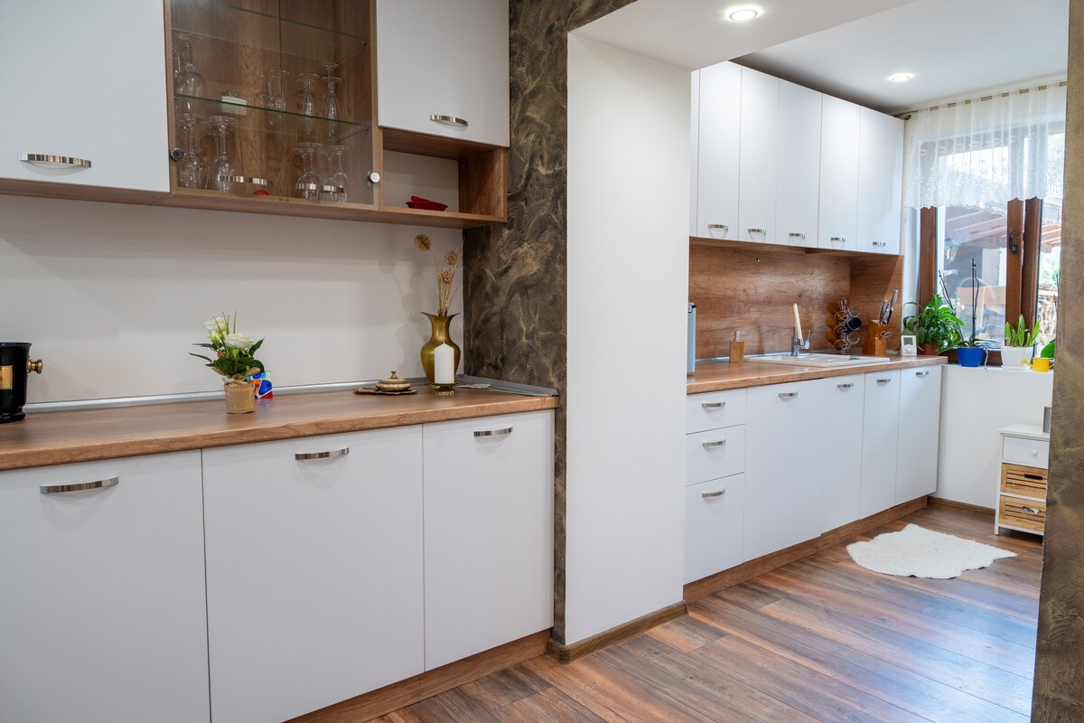 dağın ətəyində, gözəl mənzərəsi olan rahat ev, öz vanna otaqları olan 3 yataq otağı, tam təchiz olunmuş və təchiz olunmuş mətbəxi olan geniş yemək otağı, unikal barbekü, qonaqların qarşısında evdə səhər yeməyinin hazırlandığı yay mətbəxi, çoxsaylı yürüyüş marşrutları və eko cığırlarını ziyarət etmək üçün pulsuz velosipedlər təklif edir
