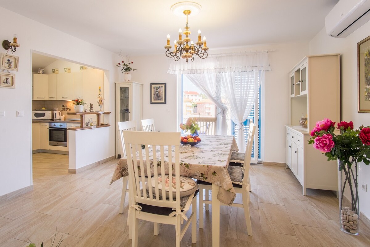 Bu yeni tikilmiş müasir yaşayış yeri sakit bir yerdədir və terrasdan köhnə şəhərə və dənizə gözəl panoramik mənzərədir. Yaxşı təchiz olunub və 2 nəfər üçün çox böyükdür. Mənzil 1 mərtəbədə yerləşir və 77 kvm-dir. Mənzil yenidir. Köhnə şəhərə və çimərliyə cəmi bir neçə dəqiqə. Mənzil Krtica 2 dənizə baxan romantik vahədir. Burada bir ikinəfərlik otaq, müasir mətbəx, geniş divanı olan qonaq otağı, böyük hamam otağı və tualet var. Tətil üçün əladır.