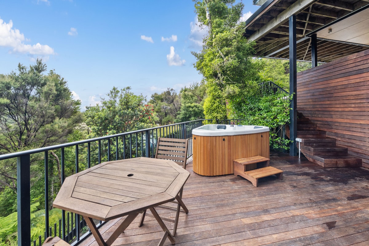 Treetops is a self-contained luxurious studio cedar chalet nestled in a sub-tropical garden with a wonderful sea view. Featuring spacious Open Plan Living, furnished with a King Bed, double Spa Bath, separate shower, full Kitchen facilities, recliner lounge suite, a BBQ on your deck; as well as having air-conditioning (Heat Pump/climate control), Freeview TV, Netflix and Free WiFi. The Treetops has 32 external stairs from the car park up to the entrance door. ** Not suitable for children