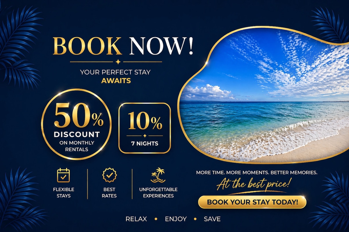 Bu lüks 2 yataq otaqlı kondominium gözəl Karib çimərliyindən və məşhur 5-ci prospektdən bir neçə addım məsafədə yerləşir. 24 saat təhlükəsizlik xidmətimizlə özünüzü təhlükəsiz hiss edin. Tam təchiz olunmuş və müasir kondominium mükəmməl tətilləriniz üçün yüksək keyfiyyətli mebellərlə təchiz edilmiş ən yaxşı örtüklərə, geniş, işıqlı və müasir dizayna malikdir. Eksklüziv və ayrıca açıq hava məkanı yalnız böyüklər və uşaqlar üçün olmaqla 2 hovuz, açıq havada cakuzi, sauna, yaxşı təchiz olunmuş idman zalı, barbekü sahəsi olan əyləncə və istirahət təklif edir