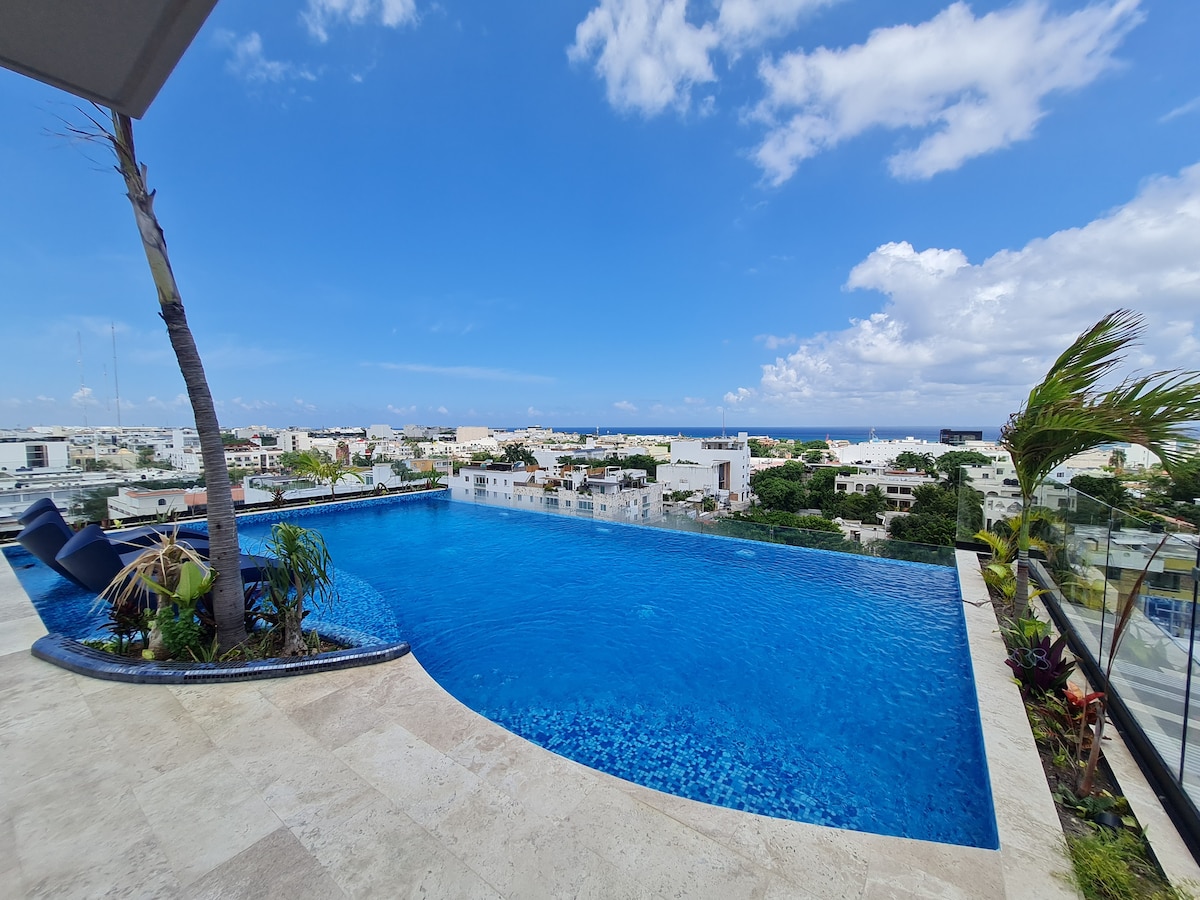 Bu məkan Playa del Karmenin mərkəzində strateji mövqeyə malikdir: Məşhur Kvinta Avenidadan 4 blok, o qədər yaxın məsafədə gəzə və supermarketdən sadəcə bir blok ayıra bilərsiniz. Bura çox təhlükəsiz ərazidir. Burada cəmi bir neçə addım məsafədə restoranlar və hər cür xidmətlər tapa bilərsiniz. Binanın ümumi ərazisində Karib dənizinə baxan gözəl dam hovuzu, idman zalı və barbekü sahəsi var. Mənzilin daxilində A/A, mətbəx, televizor və Wi-Fi.