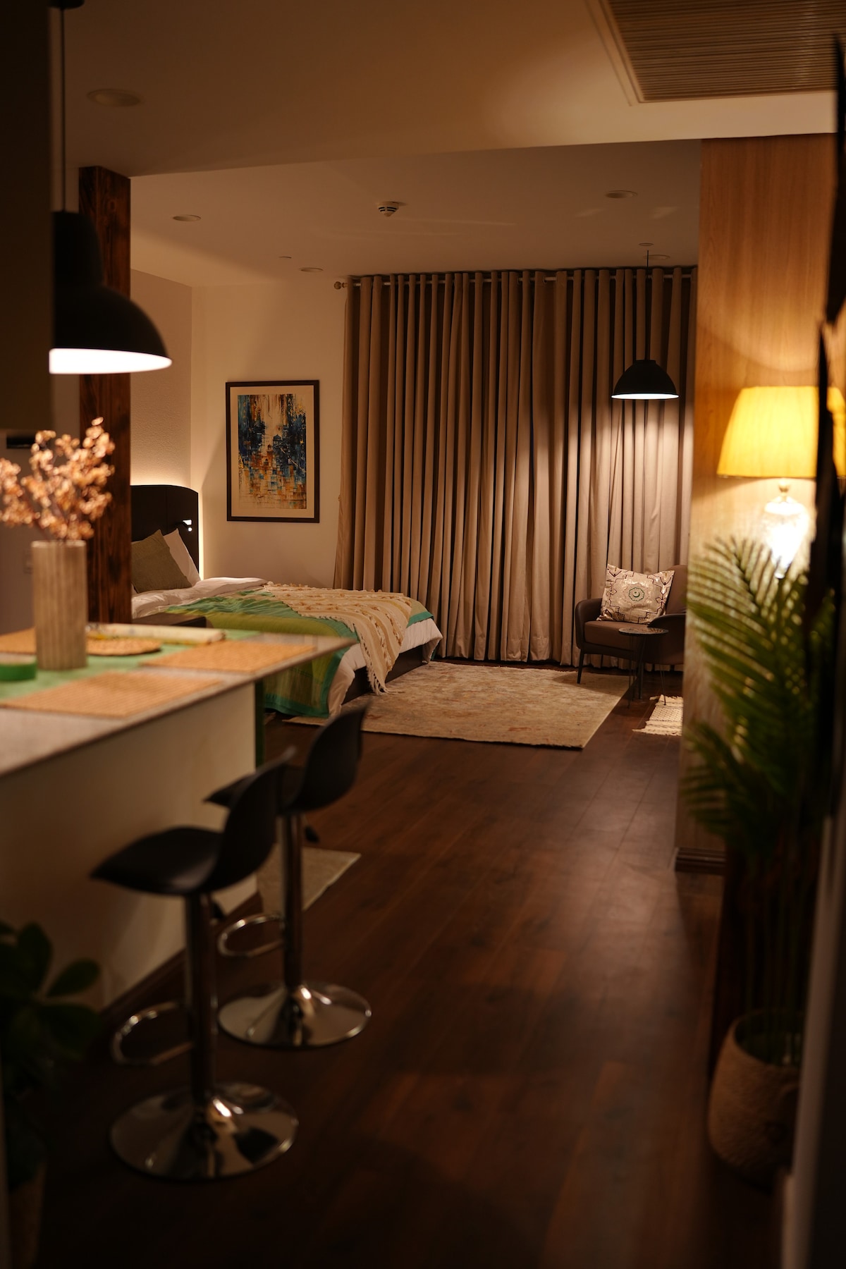 Our 1 BHK Orbit Penthouse in DHA Phase 5 is where urban chic meets celestial cool. Think: a glowing moon wall for those late-night selfies and a bold dollar-stacked art piece that screams "main character energy" Wake up to park views from your private balcony swing, binge your faves on the 50" 4K Smart TV, or cook up something aesthetic in the fully loaded designer kitchen. The interiors? Abstract, stylish, and made for the feed. Plus, you're right next to Lahore's hottest dining spots.