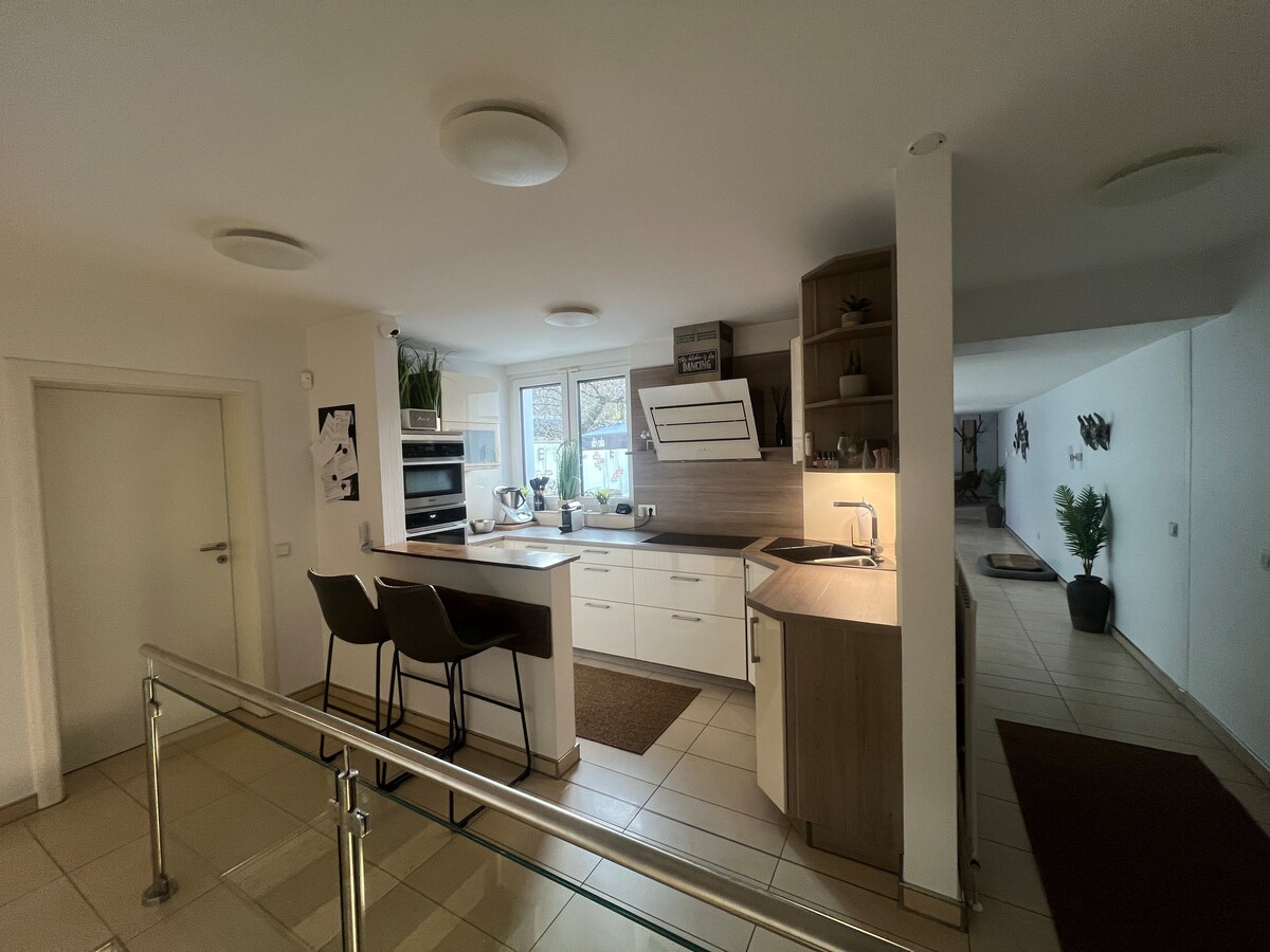 InnSaarn – moderne Wohlfühloase direkt am Wald in Mülheim-Saarn. Die stilvolle Neubauwohnung für 2–4 Personen erstreckt sich über zwei Etagen und bietet: Doppelbett (1,60 m) und Schlafcouch (1,40 m) mit antiallergener Bettwäsche, separater gemütlicher Wohnbereich mit TV, Essplatz für 4 Personen, voll ausgestattete Küche mit Minibar, modernes Badezimmer, Arbeitsplatz und kleinen Sitzbereich im Freien. Ruhig, modern, mit separatem Eingang & 24h-self-check-in/self-check-out.