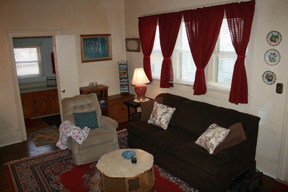Come experience our affordable upstairs Stomping Ground Studio apartment right here in the heart of Warrensburg and the home of the University of Central Missouri Mules! Centrally located, close to the University, and downtown Warrensburg, the Stomping Ground Studio is a peaceful spot for a small getaway. Located just north of campus within walking distance to downtown Warrensburg where you will find many bars and restaurants. Enjoy our quaint, UCM themed, upstairs studio during your stay!