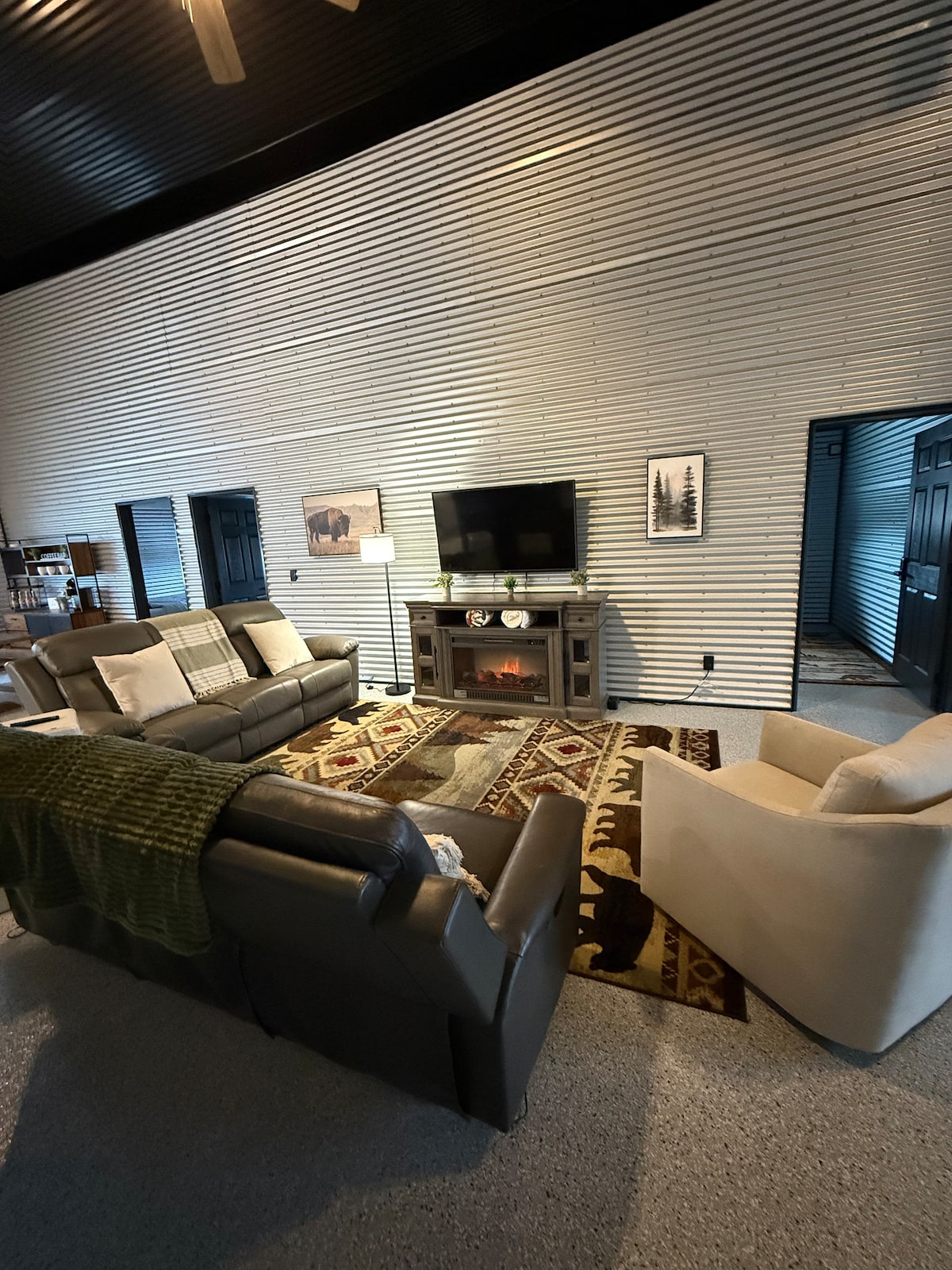 Beautiful Western saloon located on a 10 acre property in Teton Valley. Guests can enjoy stunning sunsets and sunrises at this fun and unique accommodation. This spacious, one bedroom saloon has a plush queen bed, pull-out sofa bed, cozy fireplace, and pool table. Enjoy lounging in the saltwater hot tub, or having a fire under the stars at this mountain retreat. A creek runs through the property, and there are multiple outdoor sitting areas where you can relax and enjoy being in nature.