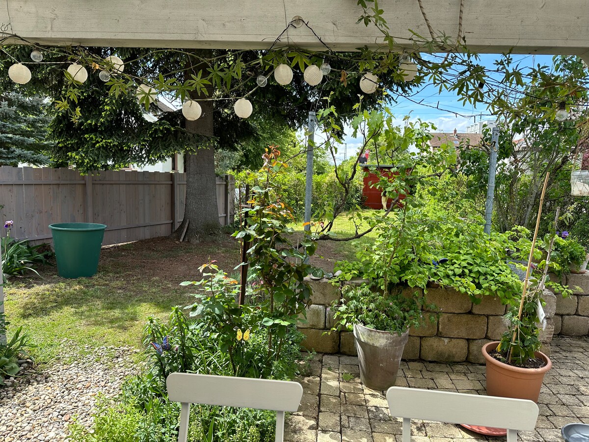 Kiçik mətbəxi, duş və paltaryuyan maşını olan hamam otağı olan ayrıca 1 otaqlı mənzil. Pulsuz yüksəksürətli WiFi6 və veranda və buxarısı olan paylaşılan bağ. Mənzil əsas qatar stansiyasından 5 dəqiqə, tramvaydan isə 1 dəqiqə 6 dəqiqə uzaqlıqdadır, bu da birbaşa eksibisiya meydanına aparır. Həmçinin Zooparka yaxındır və böyük parkın düz yanındadır. Həmçinin qiymətə ictimai nəqliyyatın pulsuz, muzeylərin/zooparkların isə 50% endirimli olduğu "BaselCard" daxildir.