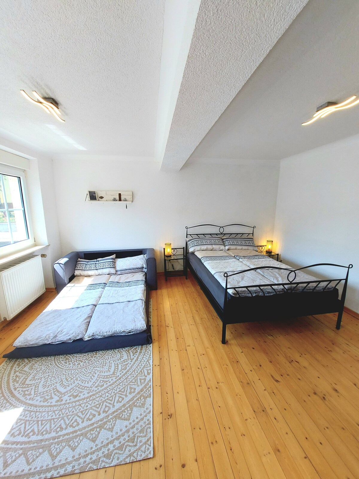 The apartment was lovingly renovated in 2021 and has 110m² (at full occupancy), with 3 bedrooms, 1 bathroom, kitchen, dining area, spacious living area and a hallway. The apartment is located in a beautiful old farmhouse with an inner courtyard. A special feature is the free WLAN with a maximum speed of 1000 Mbit/s.
