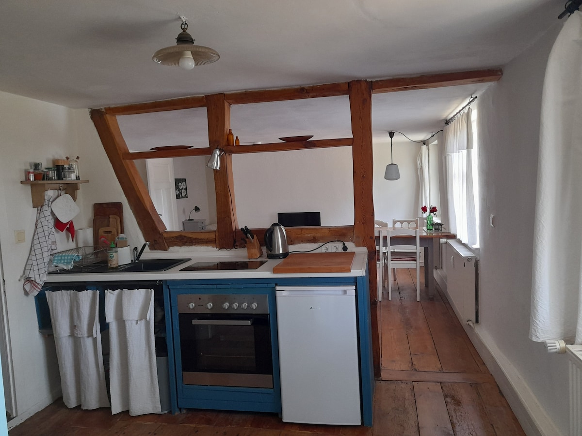 Gemütliche Ferienwohnung (ca. 75 bzw. 90 m²) in denkmalgeschütztem Fachwerkhaus. Großzügige, voll ausgestattete Küche mit Kachelofen, Wohnzimmer mit Schlafcouch, Leseecke und Kachelofen, 1 Schlafzimmer (1-2 Personen) oder 2 Schlafzimmer (ab 3 Personen), jeweils mit Doppelbett, Badezimmer mit Dusche und Sauna. WLAN in der ganzen Wohnung mit kostenlosem Internetzugang. Zentralheizung in allen Zimmern. Eigener Garten. Gegen Aufpreis verfügbar: Transfer v.Bhf,Einkaufservice,Leihfahrräder, Kanus,Gym