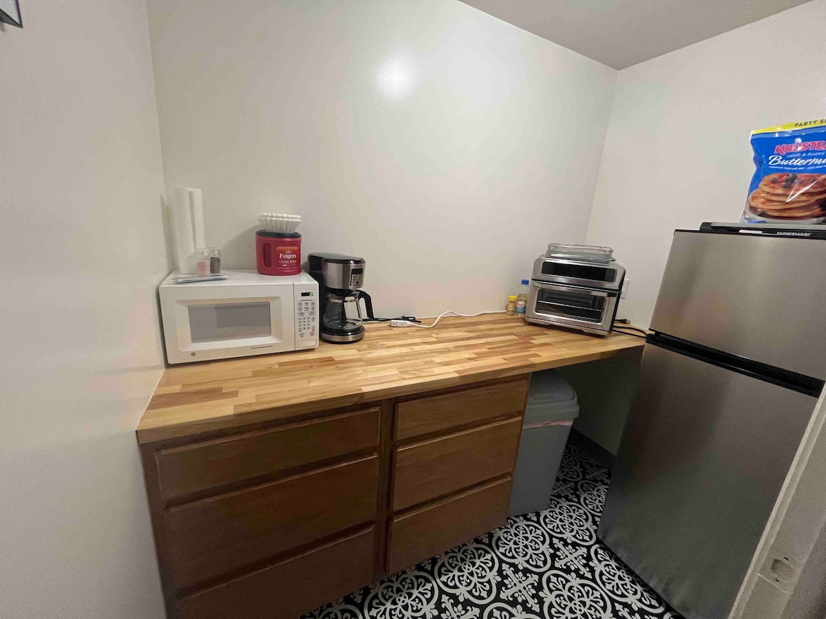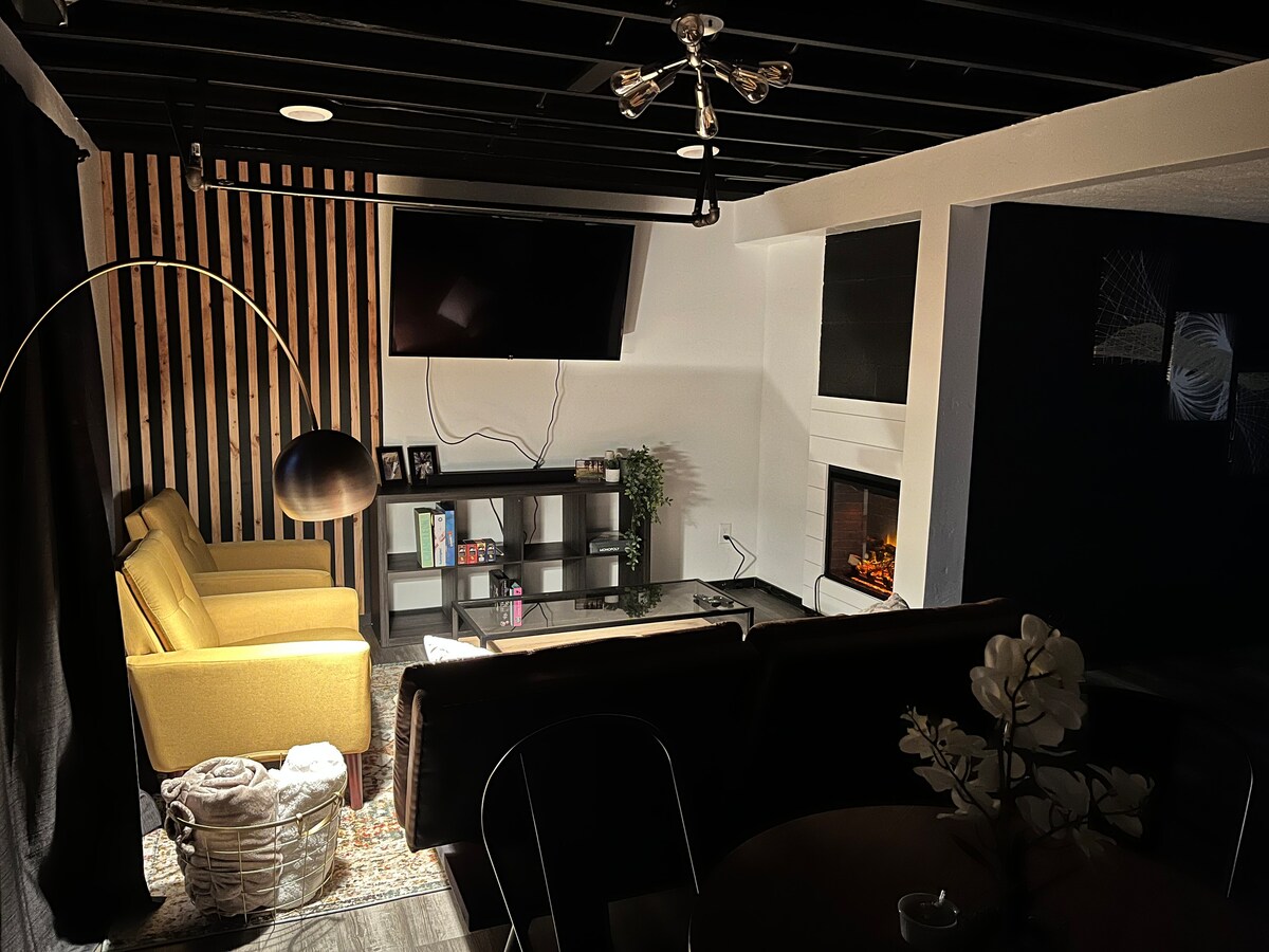 Enjoy movies on a 65” screen with surround speakers. Kitchenette includes fridge, microwave, toaster oven and pancake mix-breakfast at your leisure! Paper products provided as the only sink is in the bathroom. Workout in our shared gym 2 bedrooms-king and bunk (twin, full, trundle) and 1 bathroom Guest access: You will need to walk around back and down about 20 stairs. Things to note: The space is the basement of our home so you may hear us-fans and white noise provided. 2 vehicles only