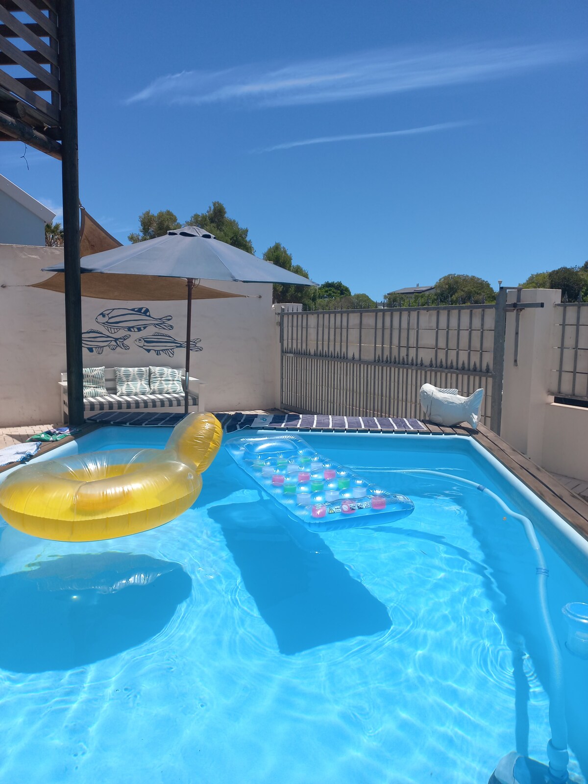 Çimərlikdən cəmi 300 metr məsafədə 6 nəfərlik parlaq və geniş ev. Hündür taxta tirləri olan açıq planlı yaşayış sahəsi, tam təchiz olunmuş mətbəx, tam DSTV axını olan smart TV, Wi-Fi və paltaryuyan maşından yararlanın. Açıq havada oturma yeri və od çuxuru olan günəşli verandada dincəlin. Həm vannası, həm də duşu olan iki müasir hamam otağı rahatlıq və sahilyanı yaşayış axtaran ailələr və ya qruplar üçün mükəmməldir. Rahatlığınızı artırmaq üçün bütün yataq dəstləri Misir pambığından hazırlanıb. Qonaqlama müddətində gecəlik adam başına 750 R.