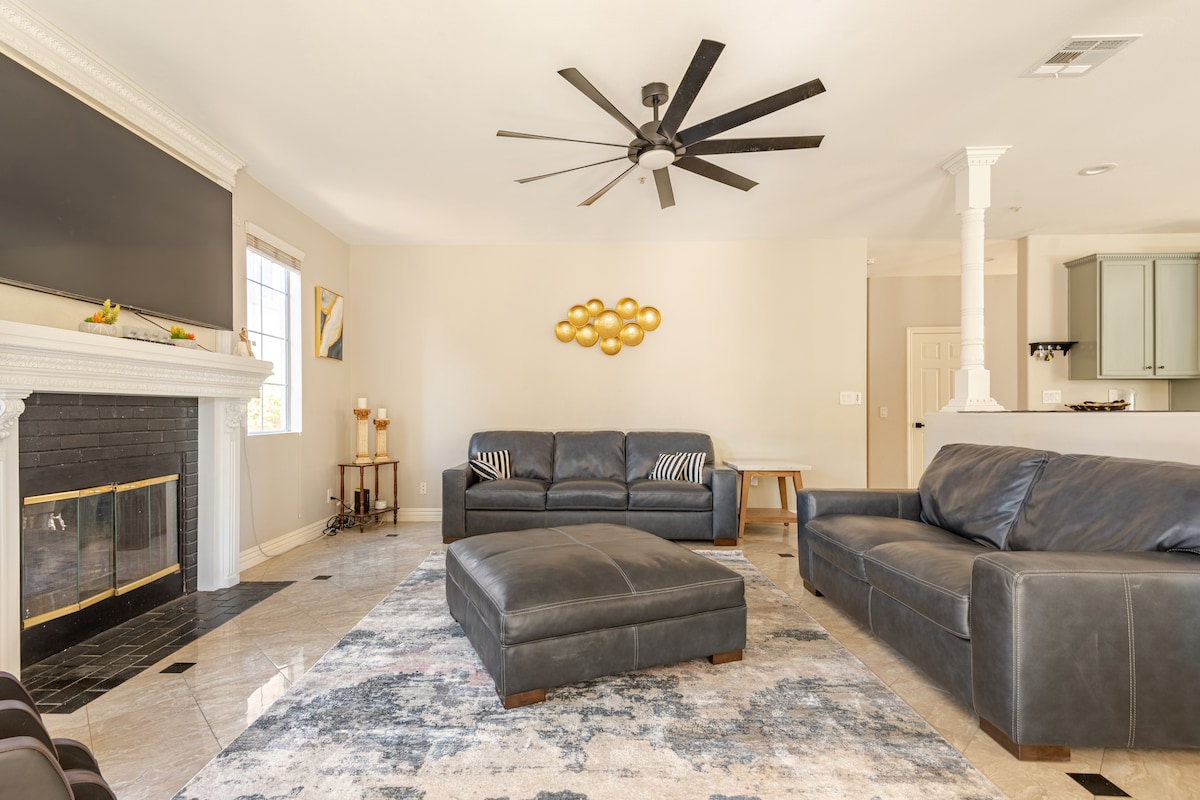 Art-filled retreat with unique artifacts, a lush garden with vibrant plants and vegetation, small pond, private pool & spa, firepit, and outdoor kitchen. Relax in a quiet cul-de-sac with two shaded patios, modern entertainment including streaming TVs, surround sound, a small pool table, and an Xbox. Ideal for families, friends, couples, or business travelers seeking comfort, privacy, and a memorable Southern California stay near Disneyland and major attractions.