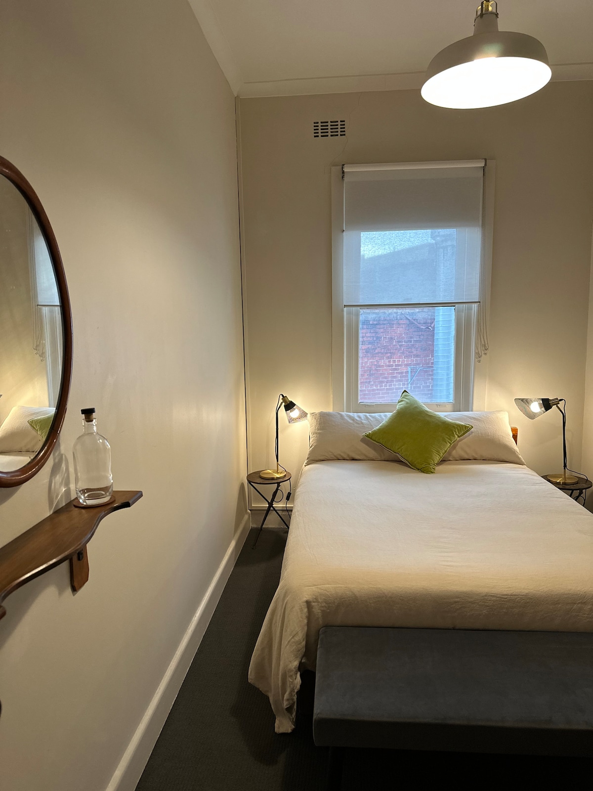 Hamam-tualeti olan rahat işıqla dolu otaq. Otaq yuxarı mərtəbədə, pivəxananın təhlükəsiz, fərdi yaşayış yerində yerləşir. Otaq ikinəfərlik çarpayı, mini-soyuducu, çaydan, toster və tv daxil olmaqla bütün zəruri ləvazimatlarla təchiz olunub. O, Lygon St-dən qısa məsafədə yerləşir və kafe, mağaza və ictimai nəqliyyata yaxındır. Otaq pivəxanadan yuxarıda və şəhər qırağında yerləşdiyinə görə gecələr bir az səs-küy ola bilər. Bron edərkən bunu nəzərə alın.