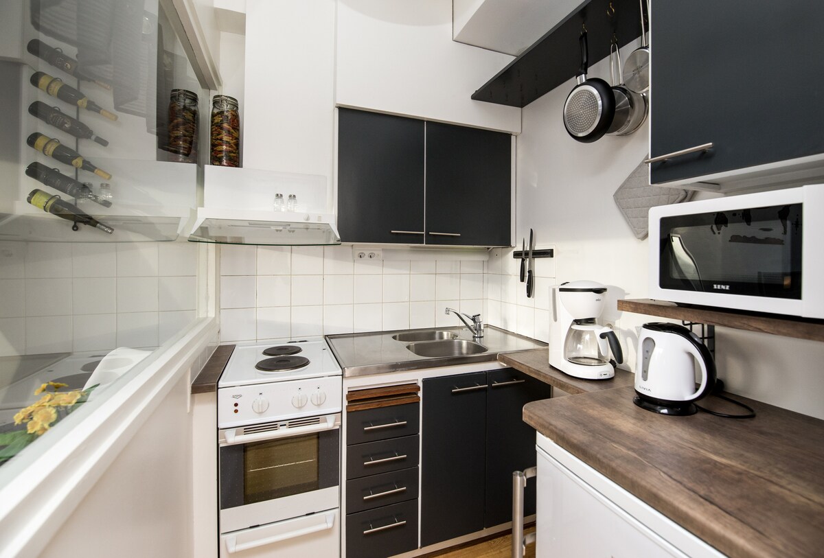 Recently renovated apartment (58m2, bedroom, living room, kitchen and bathroom) in an old wooden house in the absolute center, very close to City Theatre. Peaceful yard with parking included. Bicycles at your disposal. The apartment is one of 6 in this family house. Common areas are on the upper floor where also self-service breakfast is served. There is a sauna, large balcony and lounge. Summertime there is also a large terrace with grill in the yard. Not suitable for parties.