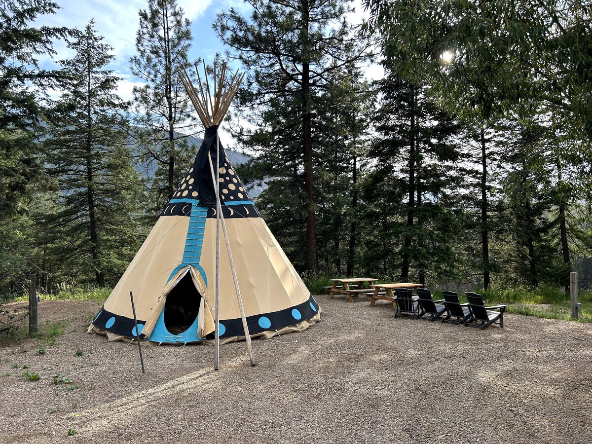 Queen log Bed with comfy mattress. 18 foot tipi on 20x26 foot wooden deck. Outstanding views of the Canadian Rockies. <10 minutes from Lake Koocanusa. 5 minutes from the Tobacco River. <10 Minutes from Abayance Bay. 15 minutes from Eureka MT. 12 miles from Canadian border. Shower and toilet with a kitchen and sink. Propane fire. Hammock. Picnic Table, NO pets, infants and pre-toddlers. Well behaved children 10 and above welcome. Plenty room for large boats. Season ends at end of September,