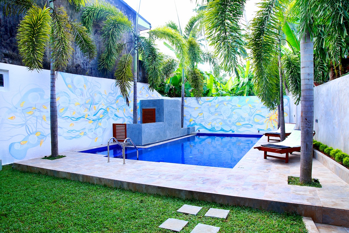 Lüks villa, şəxsi hovuz 🏊♀️ 🏝️ Villa 171 Bentota Şri-Lankanın cənubundakı ən məşhur şəhərlərdən birində yerləşir. Bentota çimərliyinin yaxınlığında yeni tikilmiş lüks villa, çimərliyə piyada 15 dəqiqəlik və ya Tuk Tuk ilə 2 dəqiqəlik məsafədə. Villada iki kondisioner, king-size ölçülü çarpayıları olan yataq otaqları (bir ikinəfərlik otaq və bir üçnəfərlik otaq), iki bitişik hamam otağı, mətbəx, qonaq otağı, açıq havada oturma sahəsi, veranda və uşaq hovuzu olan hovuz var.