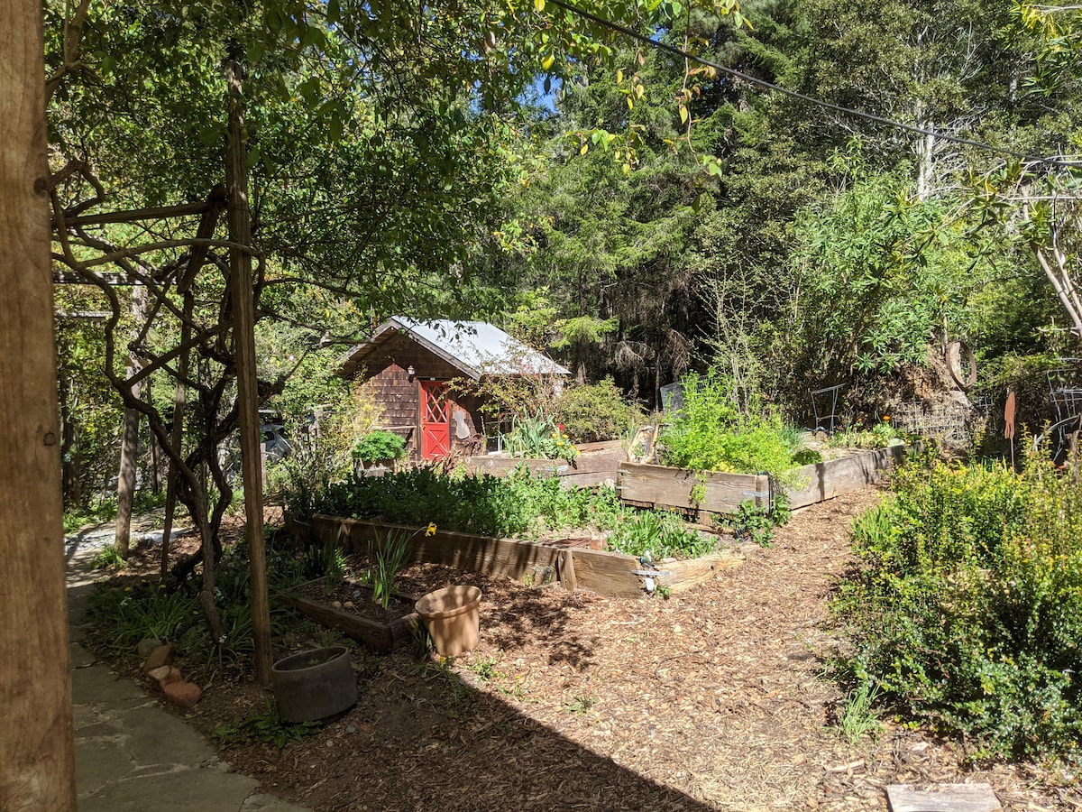 Cozy little guest shack looking out on giant redwoods at our sweet old homestead. Perfect stop on a road trip, just 1.5 miles from HWY 1 and endless coastal adventures. 🛏️ Indoors: Queen sized bed with cozy cotton flannel sheets, down comforter, and fluffy pillows, love seat, pour over coffee set up, small cooler, books galore. ✨No Wifi ✨ 🌲 Outdoors: hot shower with view of the redwoods and open sky, sink, composting toilet greenhouse bathroom about 30 steps from the cabin.
