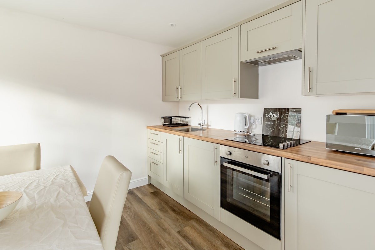 Bright, self-contained annexe on the 1st floor with private entry and lockbox for easy check-in. Features a king-size bed, sofa bed, dining area, and kitchenette with fridge/freezer, toaster, and tea/coffee facilities (no hob/oven). Mezzanine with two single beds, accessed by stepladder with lockable gate. Modern ensuite with shower and fresh towels. 42” TV with Netflix (no terrestrial TV). Private parking for 2–3 cars. EV charger available on request for a fee.
