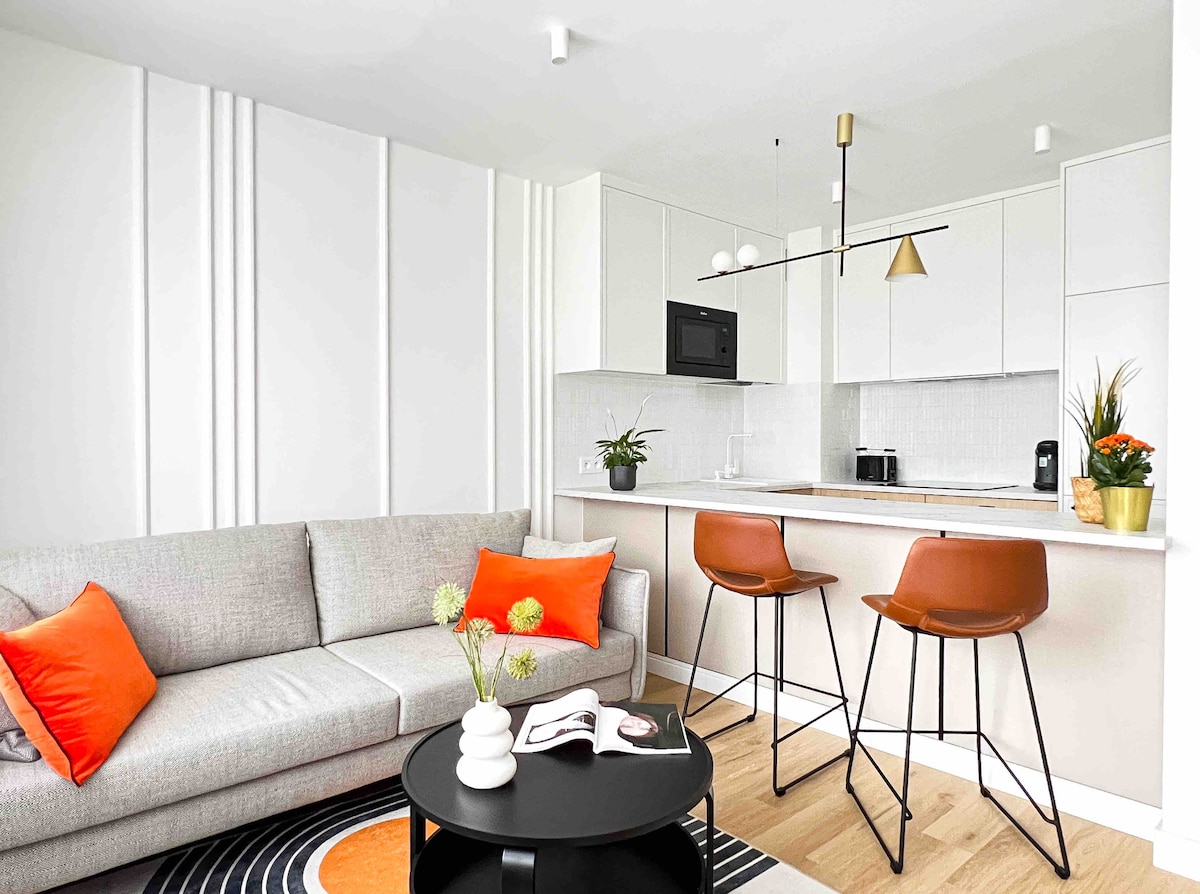 Yeni tikilidə rahat, tam təchiz olunmuş mənzil. Açıq mətbəxi olan qonaq otağı yemək və oturma sahəsinə bölünüb. Yataq otağında böyük çarpayı və geniş qarderob var. Əlavə saxlama yeri kimi yeriş dolabı da var. Yaxınlıqda mağazalar, restoranlar və kafelər var. Avadanlıq: kondisioner, espresso maşını, çaydan, ütü, ütü masası, paltaryuyan maşın Şopen hava limanından getmək 20 min taksi 50 min rabitə modlin hava limanından 50 min taksi 120 min rabitə