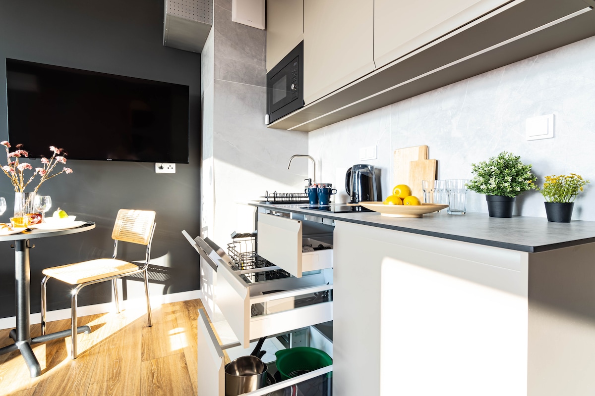 Ayrıca yataq otağı və yeraltı qarajı olan dəbli mənzil qiymətə daxildir. Yüksək standart rahat qalmağa imkan verəcək. Rahat yataq, ağıllı televizor, sürətli Wi-Fi, tam təchiz olunmuş mətbəx, yataq dəsti və dəsmallar təmin edirik. Mənzilin böyük balkonu var və sıx küçələrdən uzaqda yerləşir. Binada ərzaq mağazası var, yaxınlıqda ticarət mərkəzləri (Blue City, Reduta) və restoranlar da var. Sürətli şəhər qatar stansiyasına cəmi 400 m