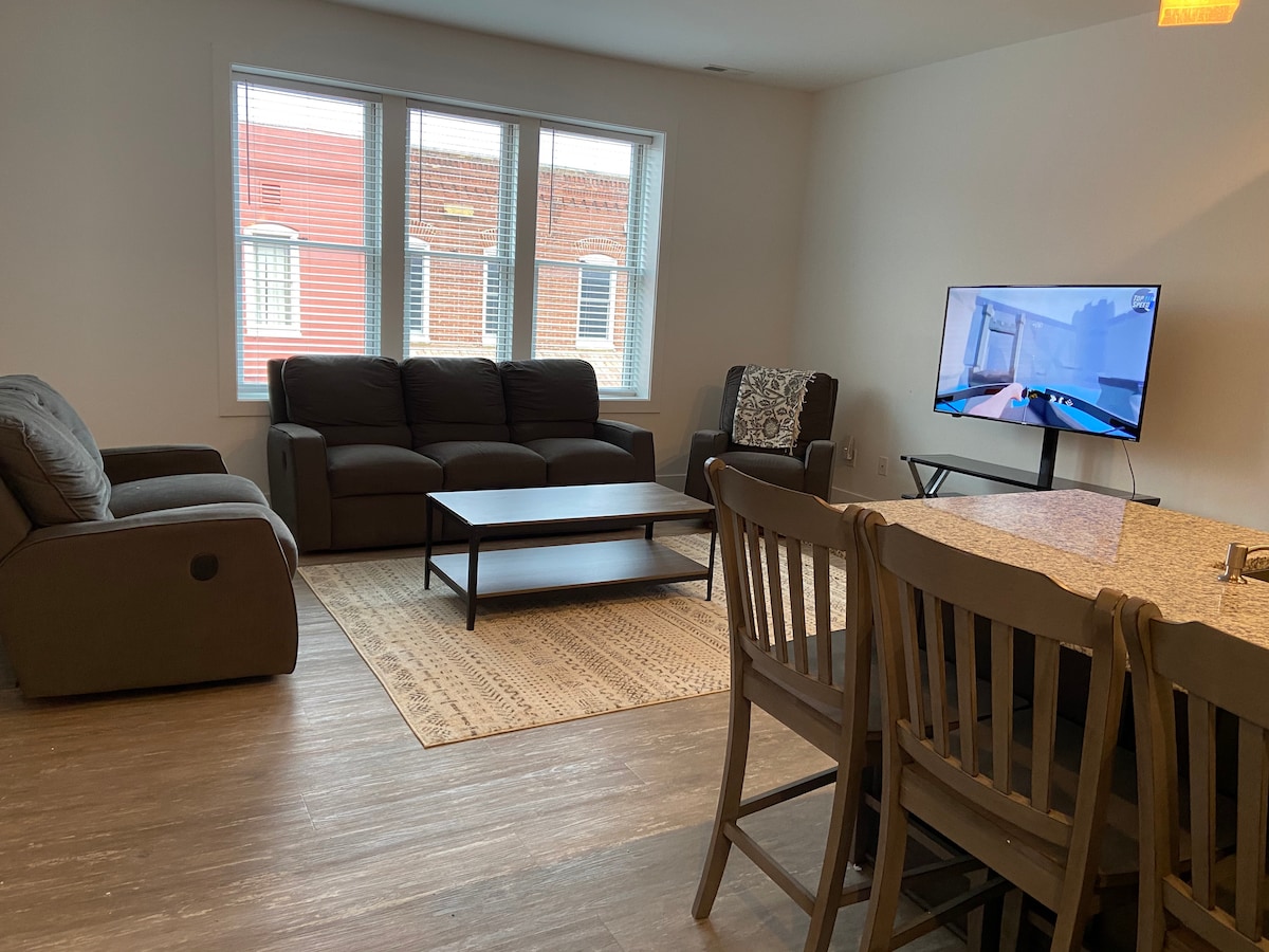 Your family will be close to everything when you stay at this centrally-located place. Right in the center of town above Fathom in Downtown Berlin, MD. Two bedrooms, each with Queen bed and own bathroom. Full kitchen and living room with views of Main St. This building has been renovated