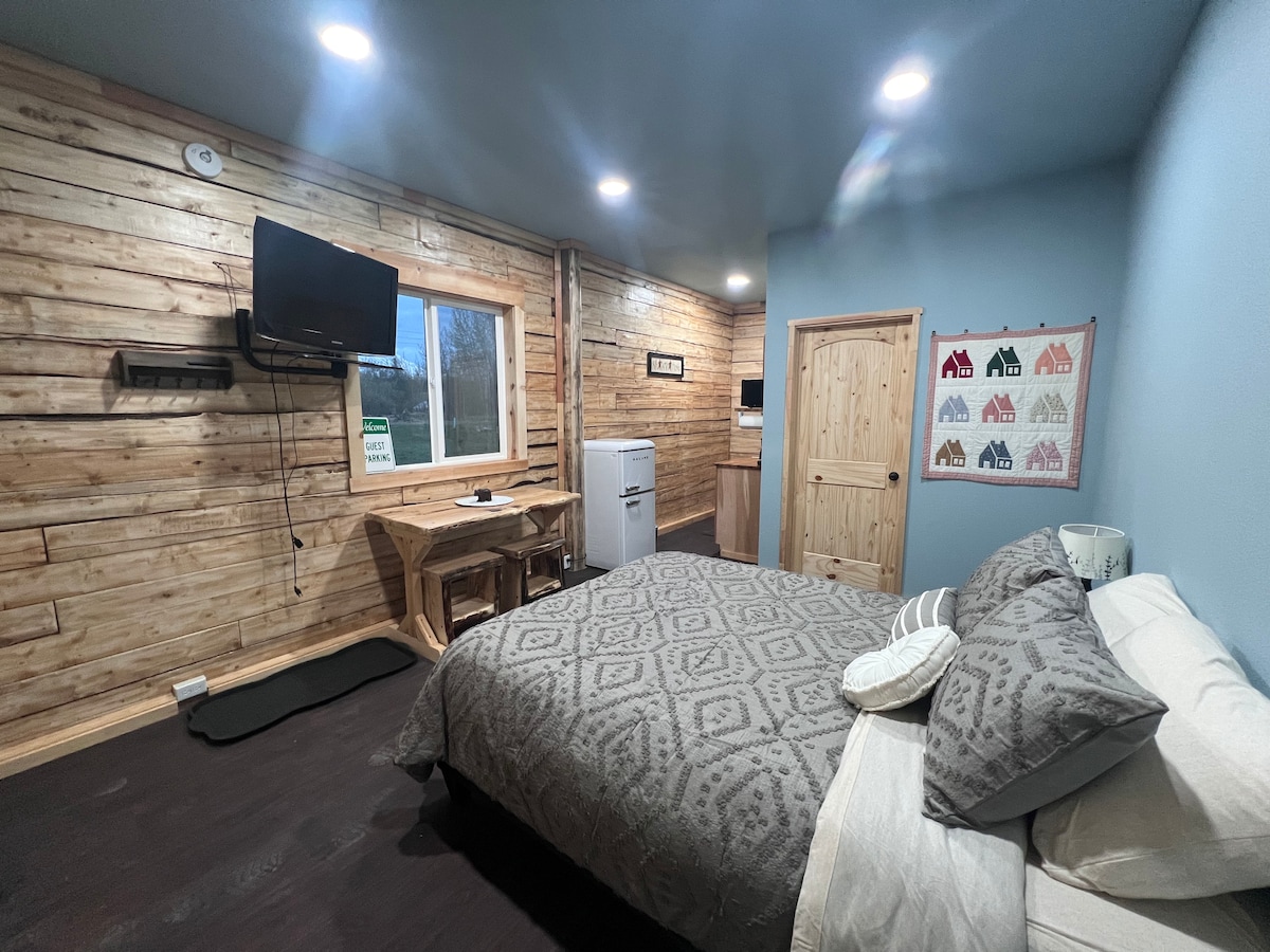 Ayrı-ayrı tikinti sahəsində sevimli studiya! Bu otaqda vaciblər var - televizor (w/Netflix), WiFi, mikrodalğalı soba, masa, qablar, hamam otağı imkanları və daha çoxu. Bu, kiçik, lakin özəldir - əsas evdən ayrıdır, buna görə də səs-küydən narahat olmağa ehtiyac yoxdur! Bu, şəhərin mərkəzində Palmerin mərkəzindədir, şəhəri gəzmək və ya Alyaskanı kəşf etmək üçün baza düşərgəniz kimi Palmerdən istifadə etmək üçün mükəmməldir. Təhlükəsiz, təhlükəsiz və ailə yönümlü. Alyaskada qonaqlamanızın yüksək səviyyədə olduğuna əmin olmaq üçün buradayıq. Səyahət planlarınızla bağlı kömək etməkdən məmnunluq duyuruq.
