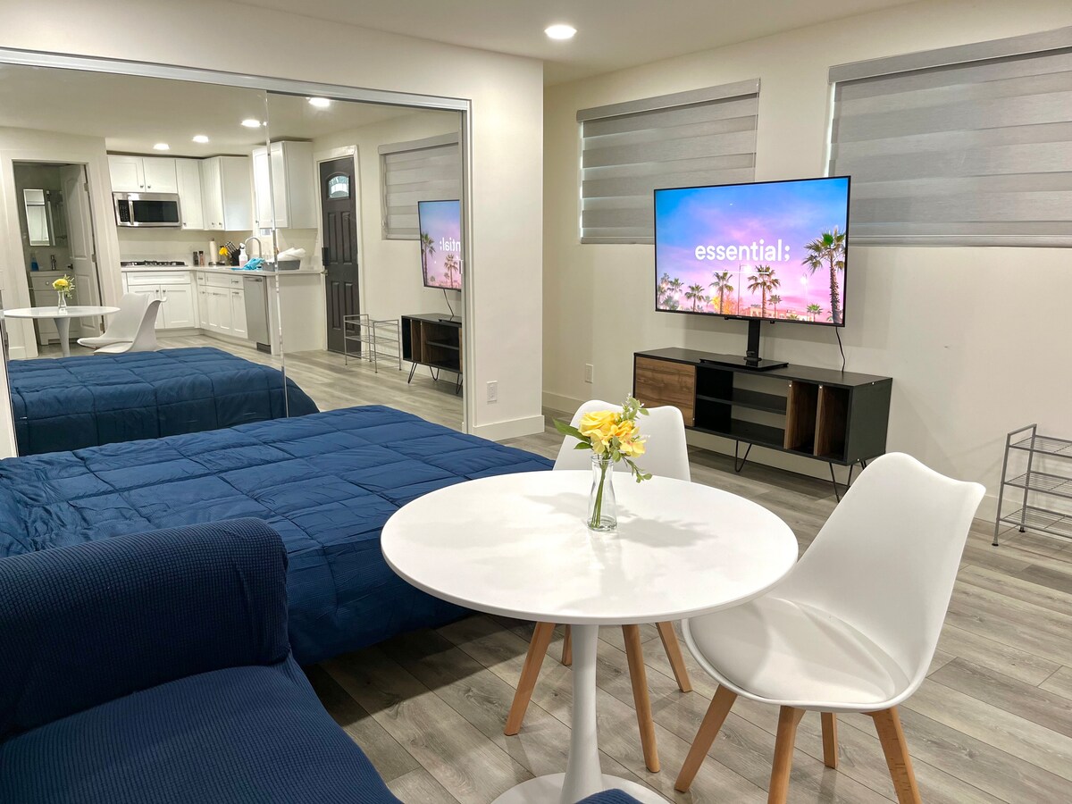 Studio in the friendly neighborhood near major attractions! - Washer/Dryer/Parking on the premises - garden - Disneyland & Knottsberry Farm 13 mins by driving 🚗 - Convenient location : close to a diverse choice of restaurants, groceries, Target, boba/ cafe KITCHEN: Stocked with all the basic essentials - pots, pans, dish ware, silverware. BATHROOM: Includes a shower towel, shampoo, body wash and blow dryer provided. Beds: Queensize bed Equipped with Netflix