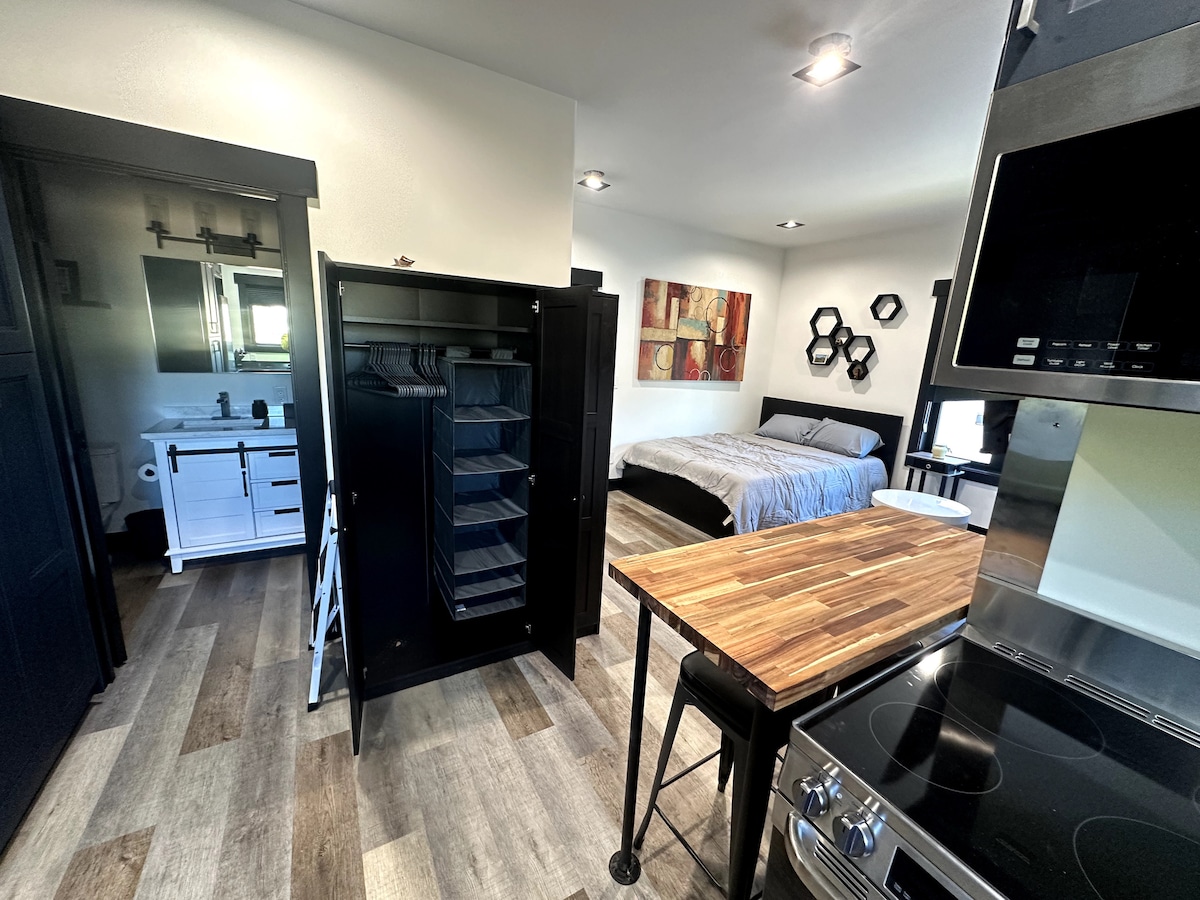 * On hektarlıq fermada rahat studiya mənzili. *Bir ədəd kraliça ölçülü çarpayı *Tam mətbəx w/ sıra, qabyuyan maşın, mikrodalğalı soba, soyuducu, toster və qəhvədan. *Böyük vanna otağı, kraliça çarpayısı olan yataq otağı, qonaq/yemək otağı və paltaryuyan maşın və quruducu giriş. * Netflix ilə simsiz internet və divara bərkidilmiş 40" Smart TV. * Şəxsi verandada dincəlin və ya 10 akrlıq əmlakımızda gəzintiyə çıxın. * Meşədə piknikdən zövq alın. Krik, gölməçə, körpü və zövq almaq üçün mənzərə.