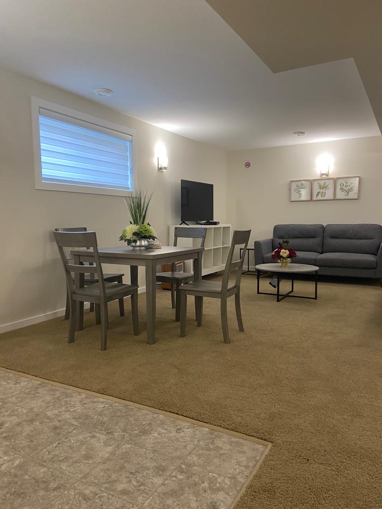 Welcome to our spacious full basement suite! Nestled in a quiet neighborhood, this suite offers a prefect blend of comfort and convenience. With its separate entrance and keypad for check-in, the suite provides privacy and a peaceful atmosphere for your stay. The open-concept design creates a warm and welcoming ambiance, featuring a spacious living area, kitchenette, and a cozy dining space. The tastefully decorated bedroom boasts a plush queen-sized bed, ensuring a restful night's sleep.