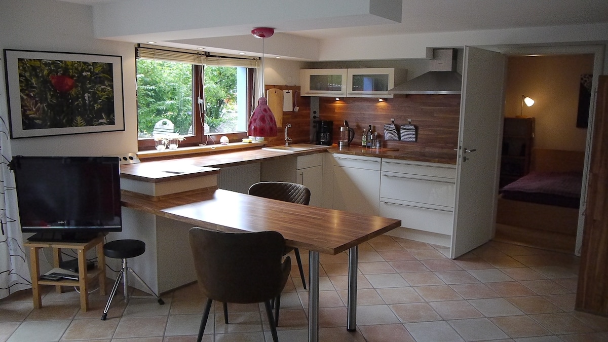 Sizi evimizin zirzəmisində təzə təmir edilmiş studiya mənzilimizə dəvət etmək istərdik. Tam təchiz edilmiş mənzil Bergisch Landın mərkəzində qonaqlamanız üçün idealdır. Qonaq otağında mətbəx, iş yeri, rahatlamaq üçün divan və 140 x 200 sm ölçüdə çarpayı tapa bilərsiniz. Gün işığı olan əlçatan hamam otağında duş, WC, baseyn və paltaryuyan maşın var.