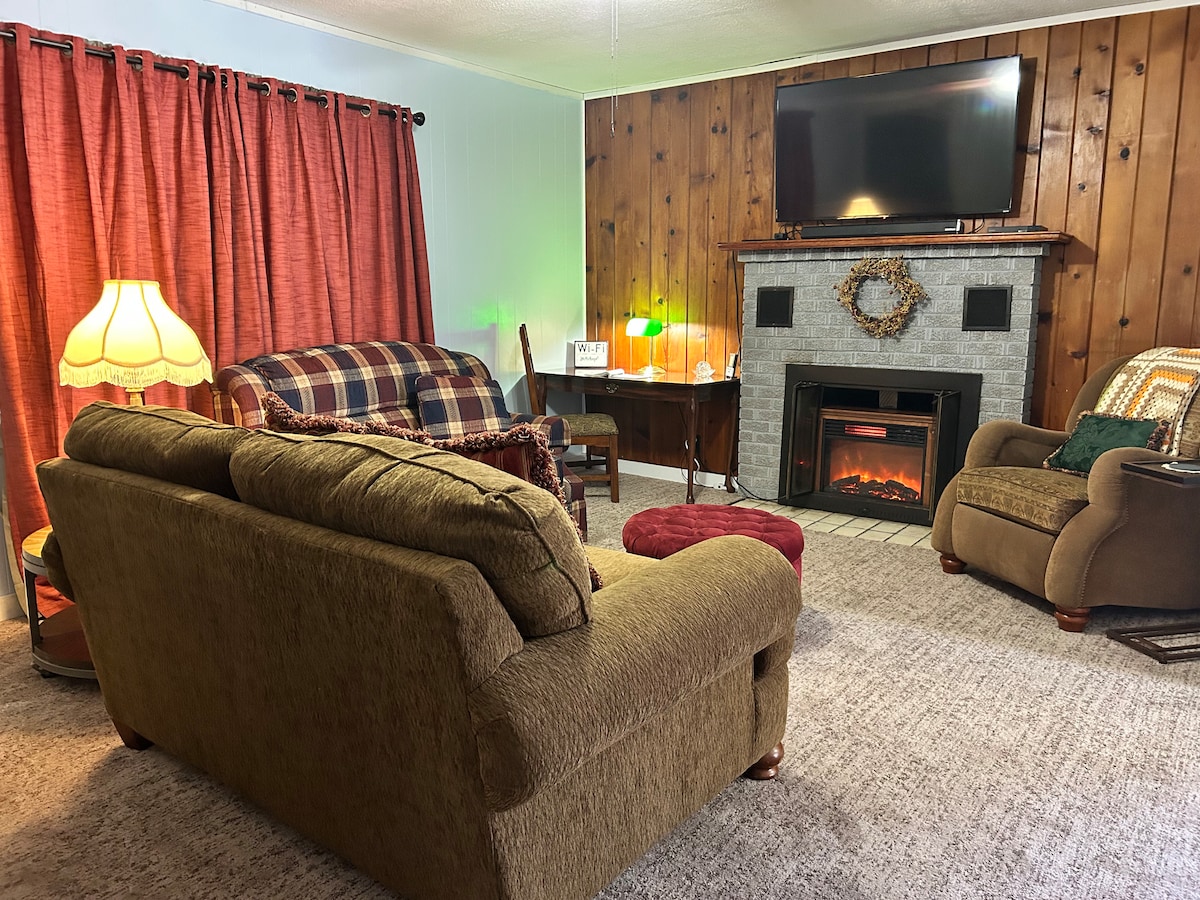 Enjoy a family getaway or a a peaceful stay with your significant other at this cabin, inside you will find a king bed and a sleeper sofa downstairs and 3 twin beds upstairs, a kitchen with cookwares and dining ware, a full size stove and oven, a full size refrigerator, microwave, coffee maker and a washer & dryer. NEW WiFi as APRIL 2026 Outside there is a back deck with a 5 seat hot tub, a front deck with a table and 2 chairs. About 20 feet from the back deck there is a fire pit.