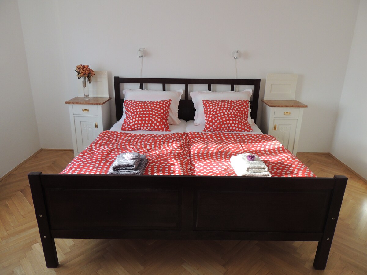 Bu eyvanlı və geniş mənzil şəhərin mərkəzində qalaya baxan vahəniz olacaq Sakit piyada zonasının daxilində Üçlü və Əjdaha Körpüsünə və Mərkəzi Bazara piyada məsafəsi olan inanılmaz mövqe. Ətrafda bir çox möhtəşəm restoranlar, kafelər, barbekü və barlar var Rahat kraliça (160 sm) çarpayı və duş və vannası olan əlavə hamam otağı. Ağıllı 40" televizor, tam təchiz olunmuş mətbəx soyuducusu, eləcə də oturma sahəsi. Döşəkağılar, dəsmallar, tualet ləvazimatları, paltaryuyan və quruducu təmin edilir