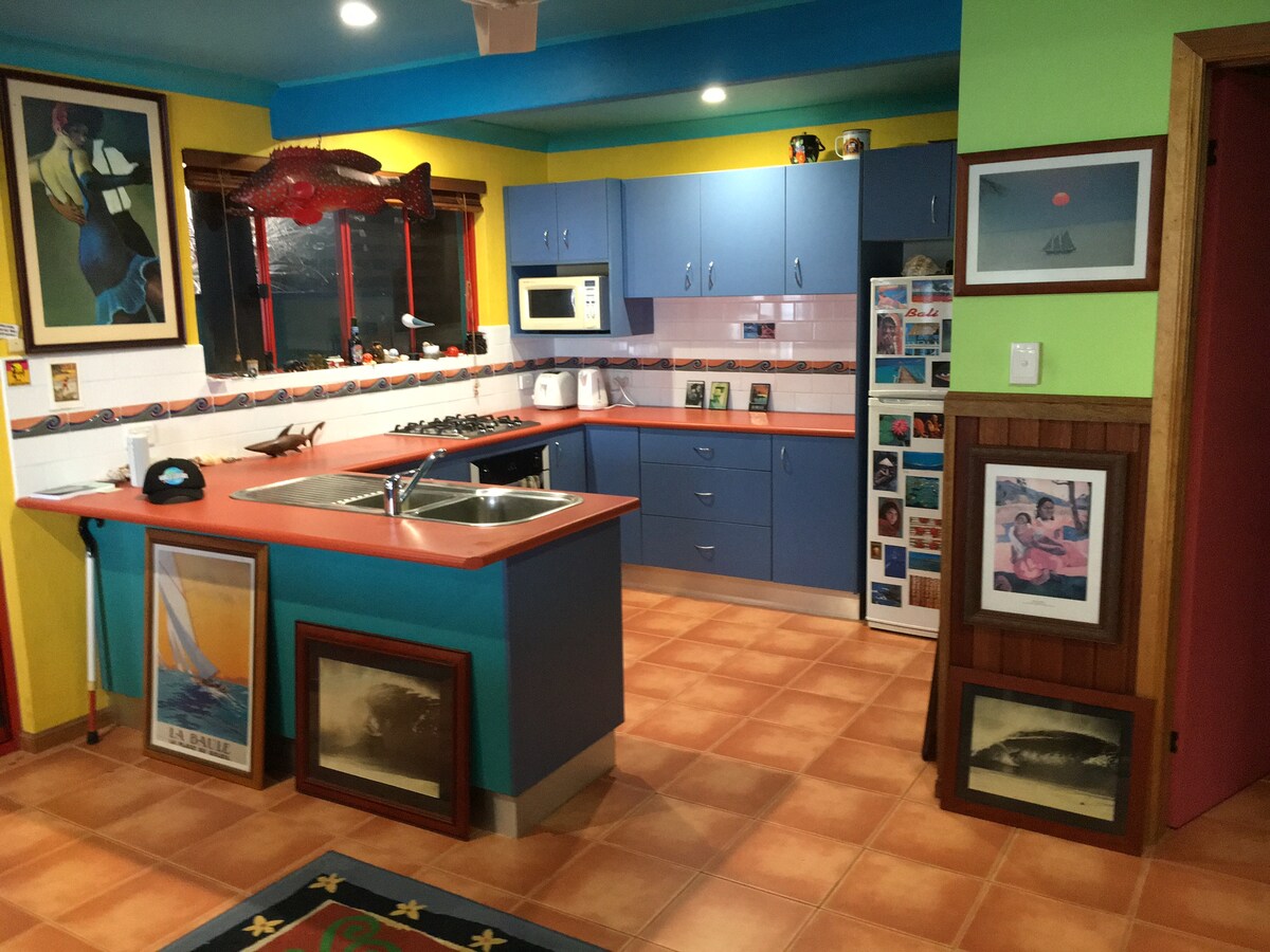 Our beach styled, comfortable and unique one bedroom open-plan villa has everything you need! It comfortably sleeps two in a beautiful King size bed , it has a lovely kitchen for nights when you want to stay in and is centrally located on a quiet street at Spooky Beach, Angourie. Enjoy a fully self contained space with a beautiful ambience it also has private verandahs on both levels.